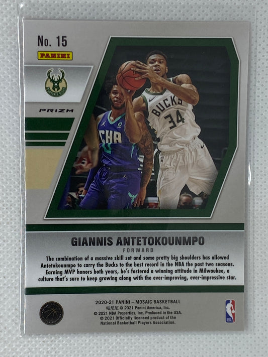 2020-21 Panini Mosaic Will to Win Silver Prizm #15 Giannis Antetokounmpo Bucks