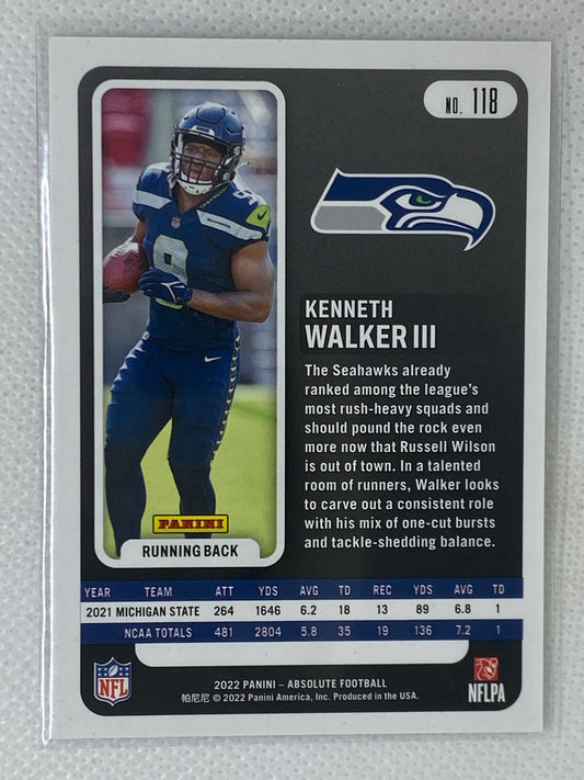 2022 Panini Absolute Football Rookie Kenneth Walker III #118 Seattle Seahawks