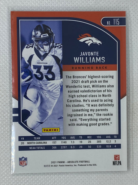 2022 Panini Absolute Football Rookie Javonte Williams #115 Denver Broncos