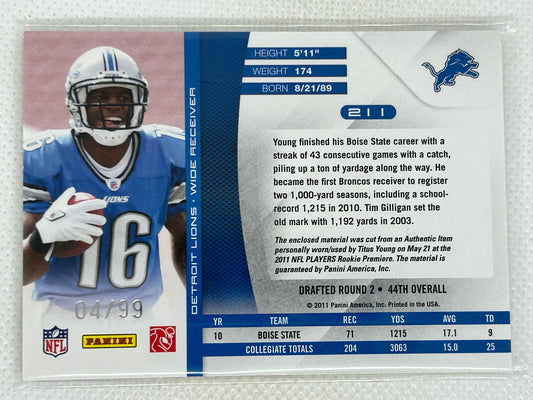 2011 Panini Absolute Memorabilia Rookie Premiere Materials #211 /99 Titus Young Detroit Lions