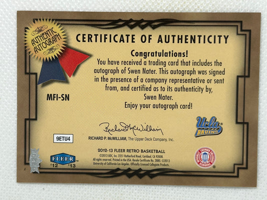 2012-13 Fleer Retro 1999-00 Fleer Mystique Fresh Ink Autograph Swen Nater #MFI-SN UCLA Bruins