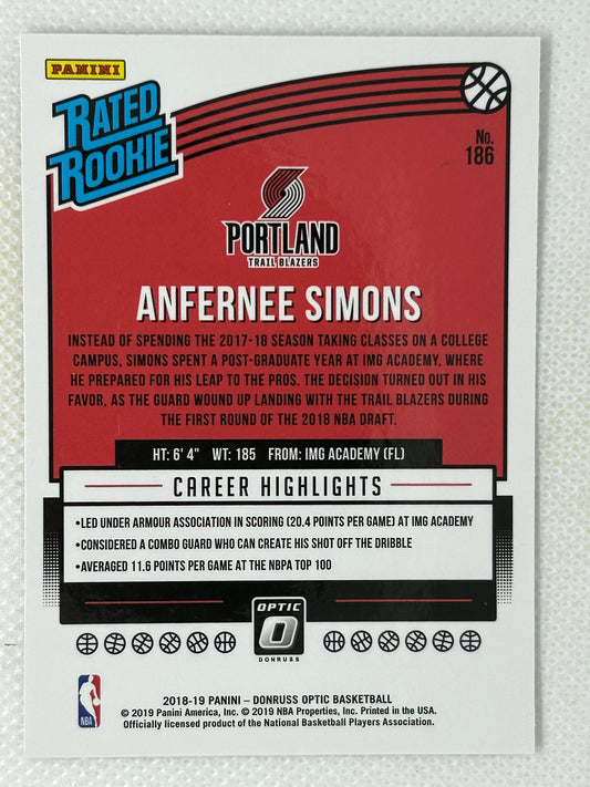 2018-19 Panini Optic Rated Rookie #186 Anfernee Simons Portland Trailblazers