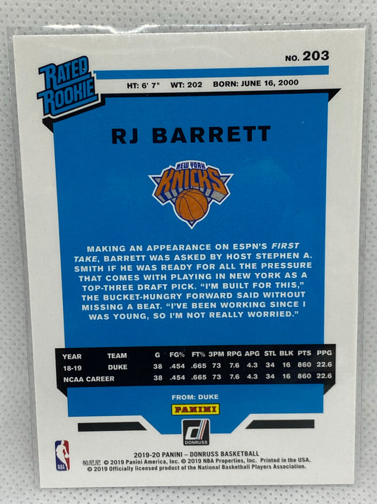 2019-20 Donruss RJ Barrett Rated Rookie #203 New York Knicks