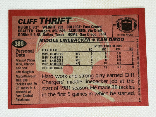1983 Topps Cliff Thrift Rookie Card #380 San Diego Chargers Signed Card