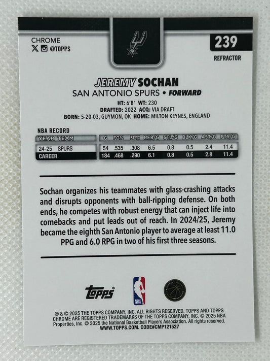 2025-26 Topps Chrome Basketball Jeremy Sochan Refractor #239 San Antonio Spurs