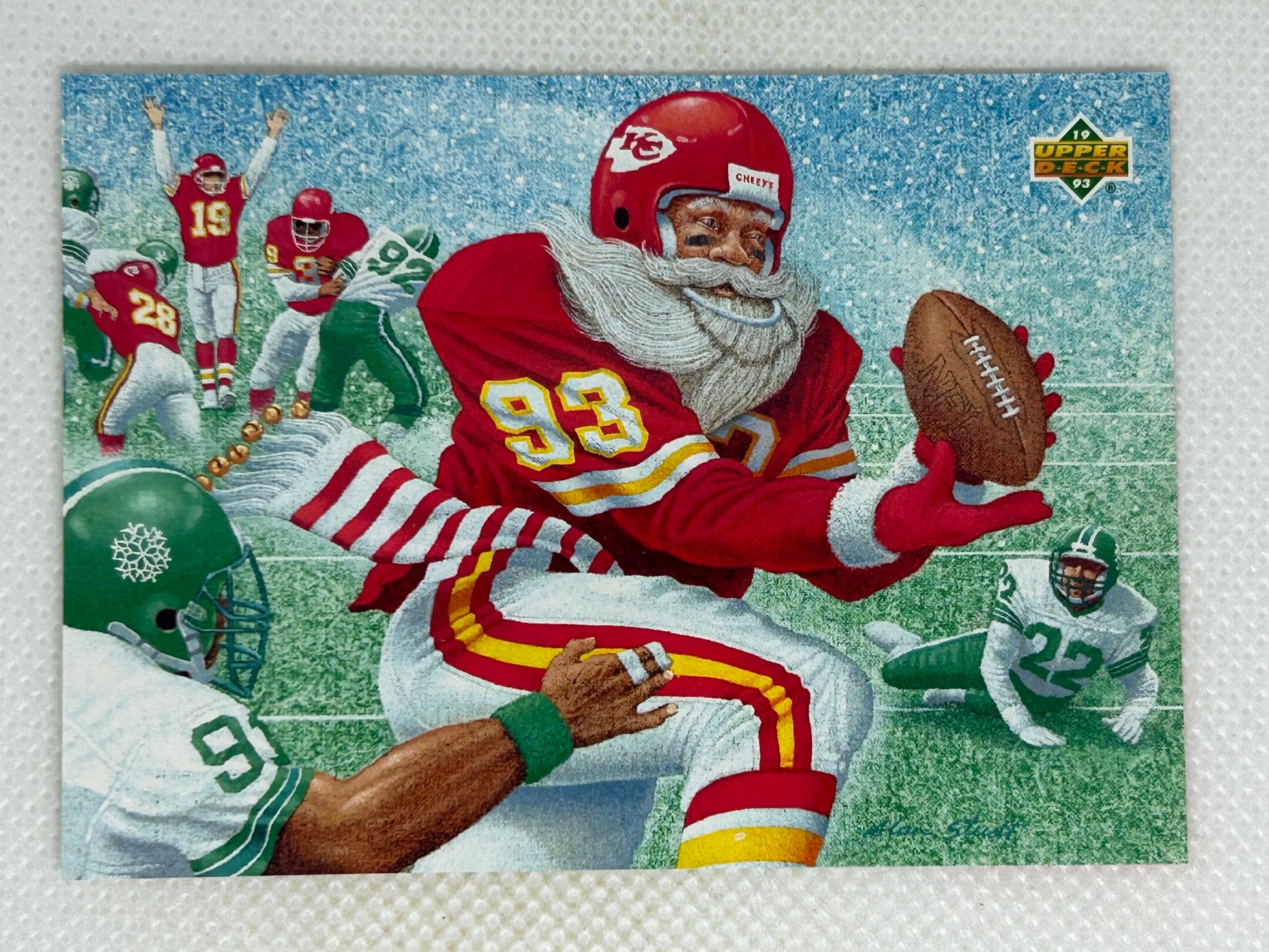 The 1993 Upper Deck Seasonal Highlights Promo Card featuring Santa Claus alongside the Kansas City Chiefs adds a festive touch to football memorabilia. While Santa Claus is not linked to an NFL career, this promotional card celebrates the holiday spirit in connection with one of the league’s storied franchises. It offers collectors a unique seasonal piece that honors the Chiefs’ ongoing legacy in the NFL.