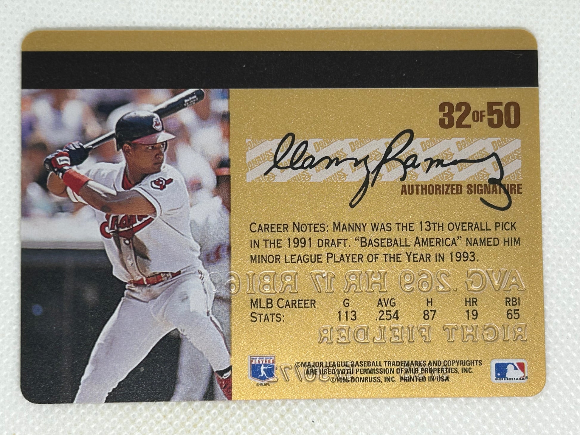 The 1995 Donruss Studio Gold Credit Card #32 features Manny Ramirez during his time with the Cleveland Indians. This card highlights the early stages of Ramirez’s impressive career, marked by his exceptional hitting skills and growing reputation. Known for his power and clutch performances, Ramirez became a key player and fan favorite throughout his years in Major League Baseball.