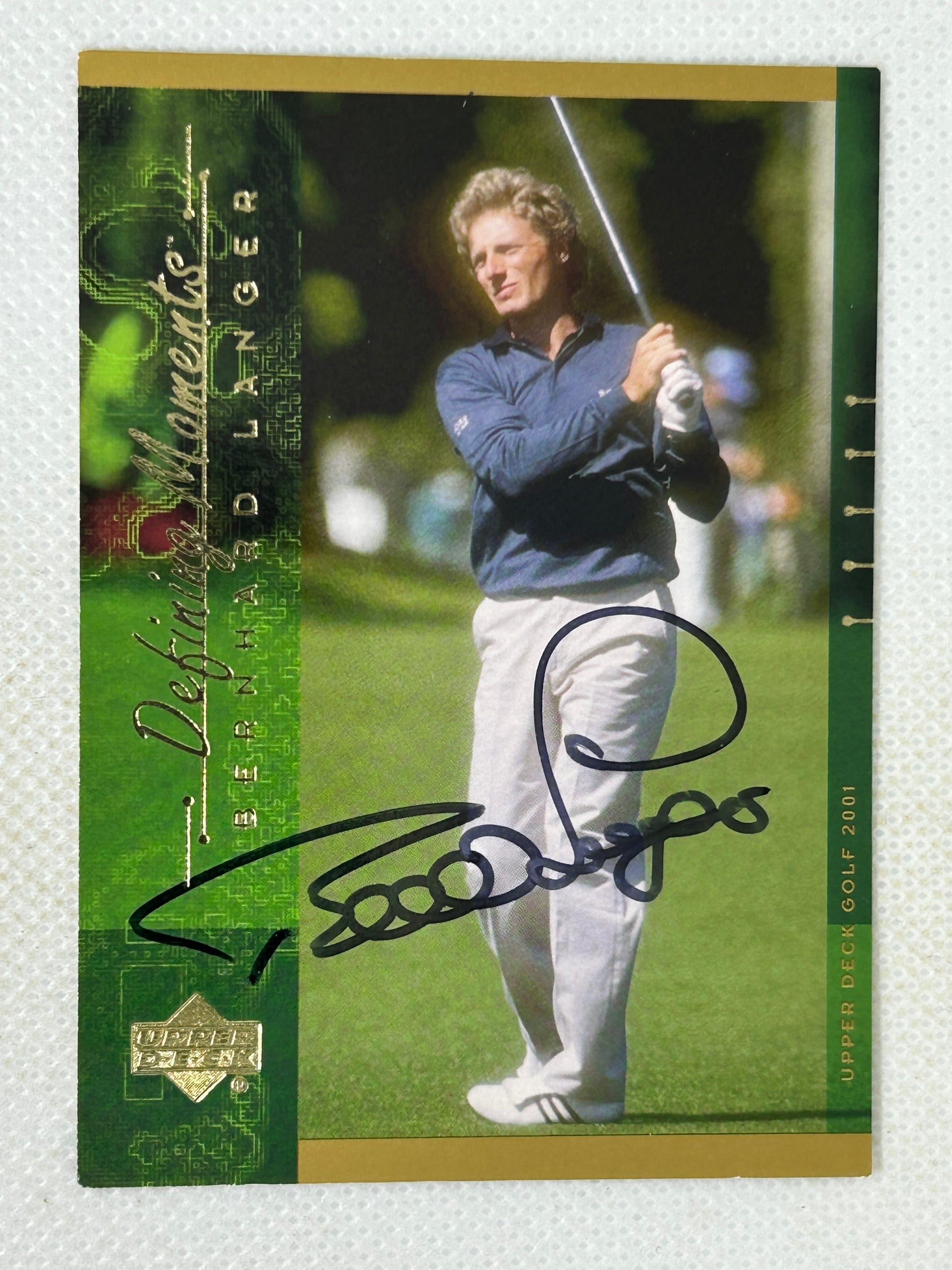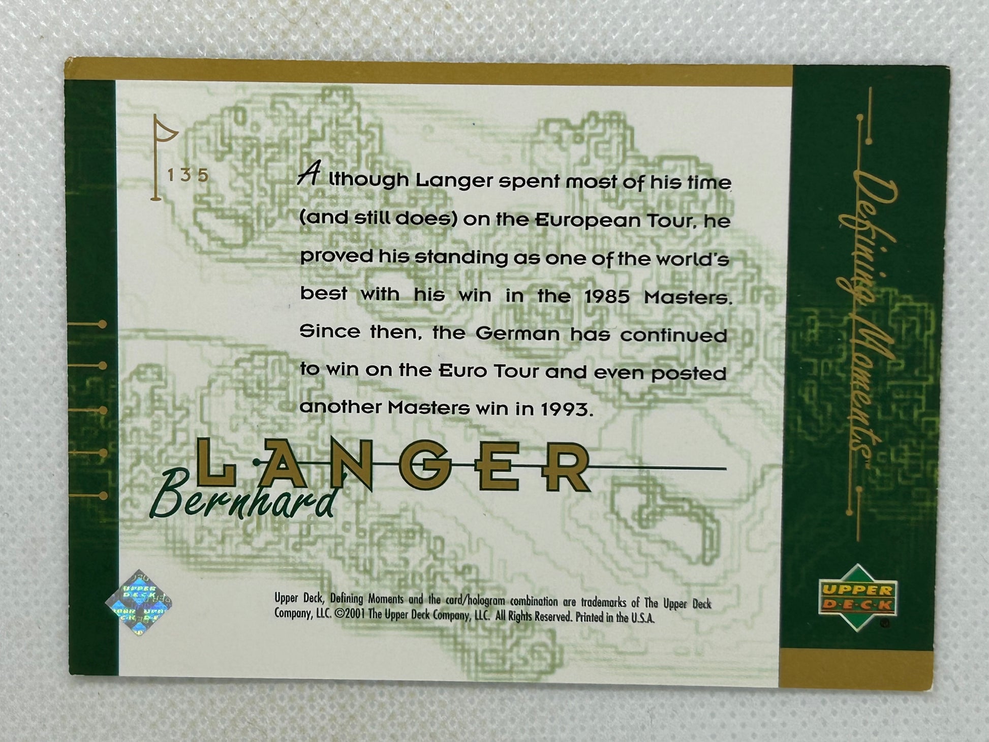 Enhance your collection with this 2001 Upper Deck Defining Moments #135 signed card featuring golf legend Bernhard Langer. Add a prestigious and valuable piece to your collection today.