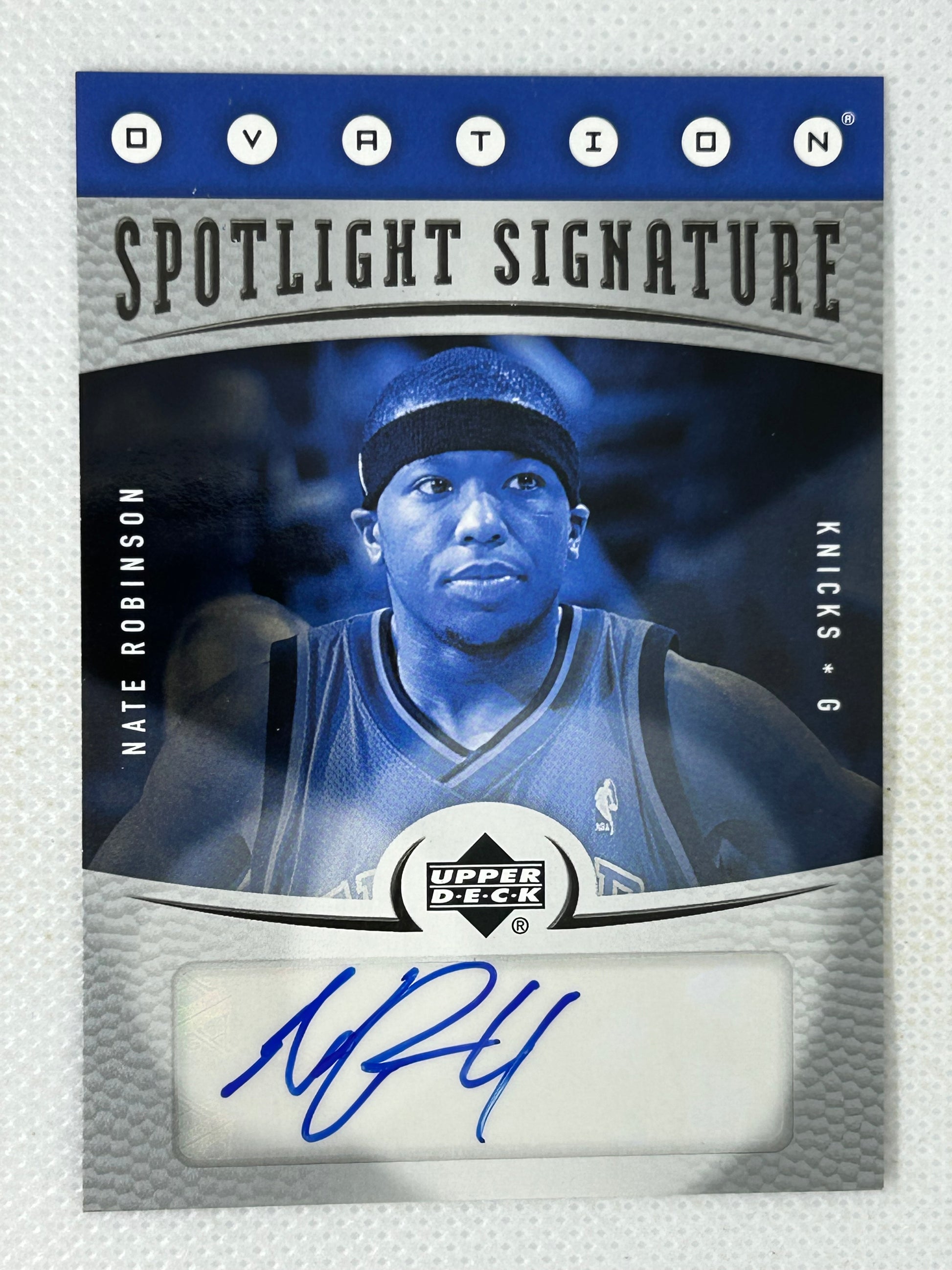 The 2006-07 Upper Deck Ovation Spotlight Signature Nate Robinson SS-NR honors the talented guard of the New York Knicks, showcasing his impressive skills through an expertly crafted card.