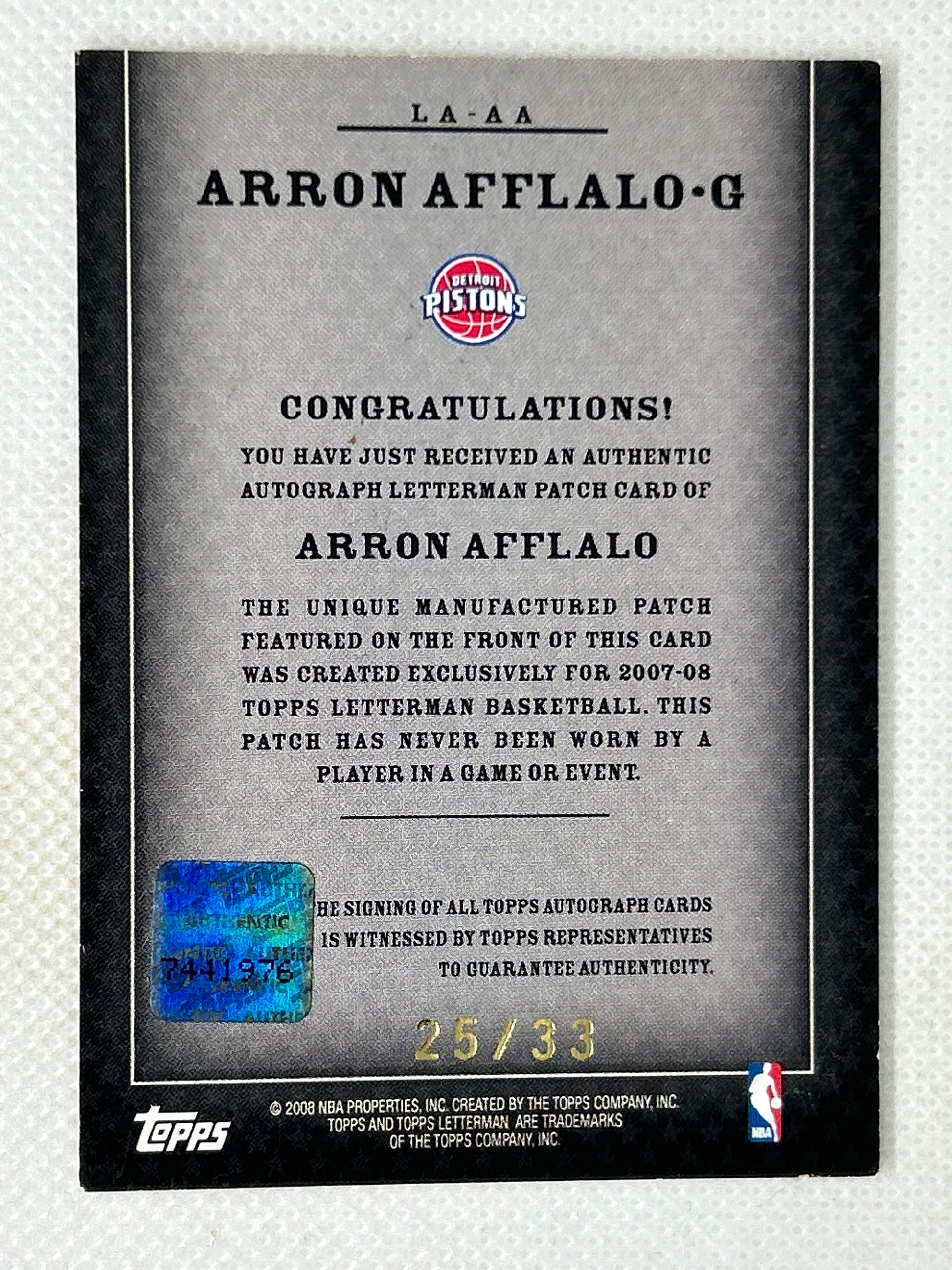 Upgrade your collection with the 2007-08 Topps Letterman Arron Afflalo "F" Letterman Autograph, limited to just 33 copies. Featuring the Detroit Pistons guard’s authentic signature, this rare card is a standout piece for collectors seeking exclusive and valuable memorabilia.