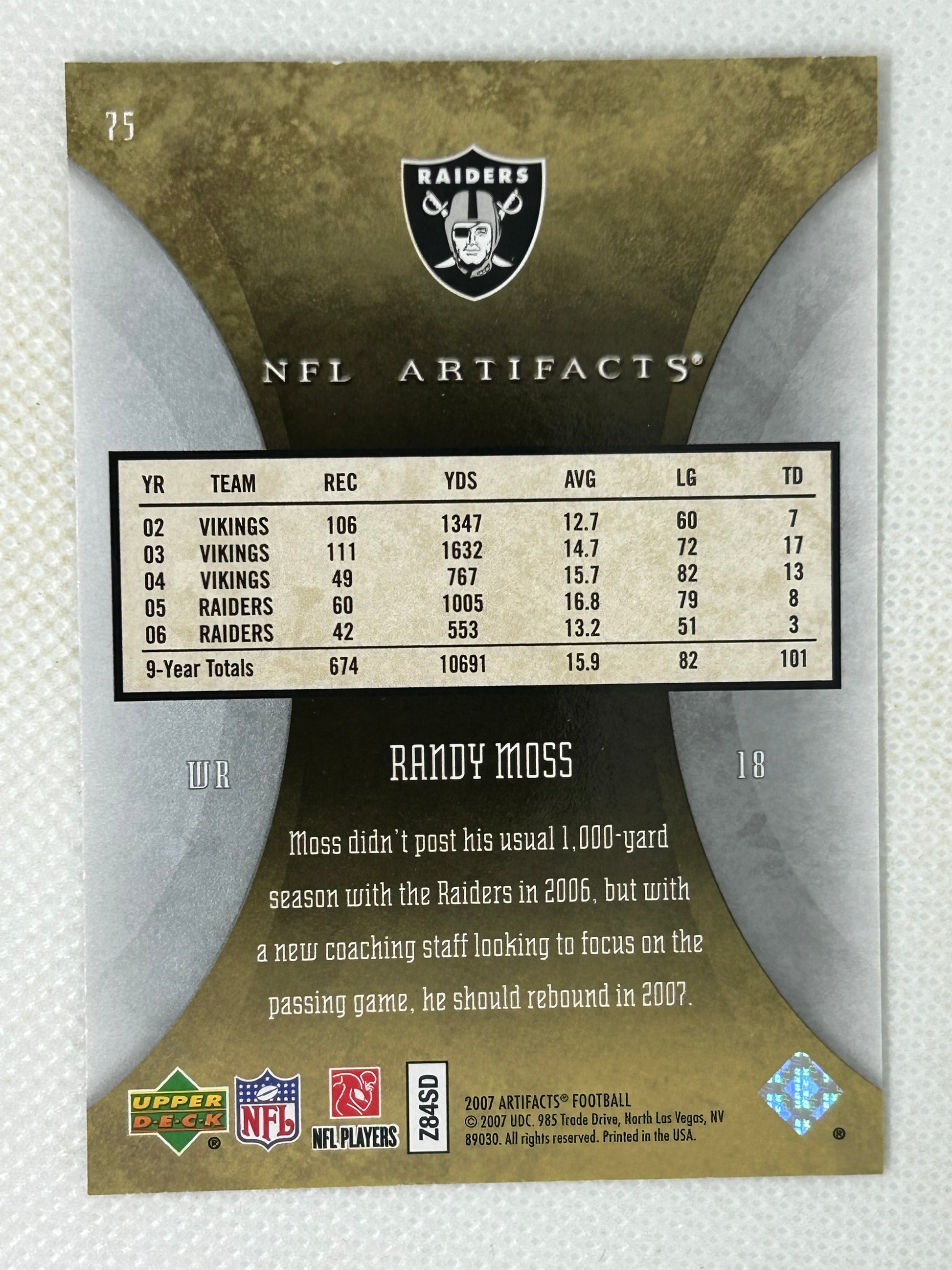 The 2007 Upper Deck Artifacts Football card #75 features Randy Moss, a legendary wide receiver for the Oakland Raiders. Known for his exceptional athleticism and playmaking ability, Moss left a lasting mark on the NFL with his remarkable career. This card celebrates his time with the Raiders and his overall impact on the game, making it a prized collectible for fans and enthusiasts.