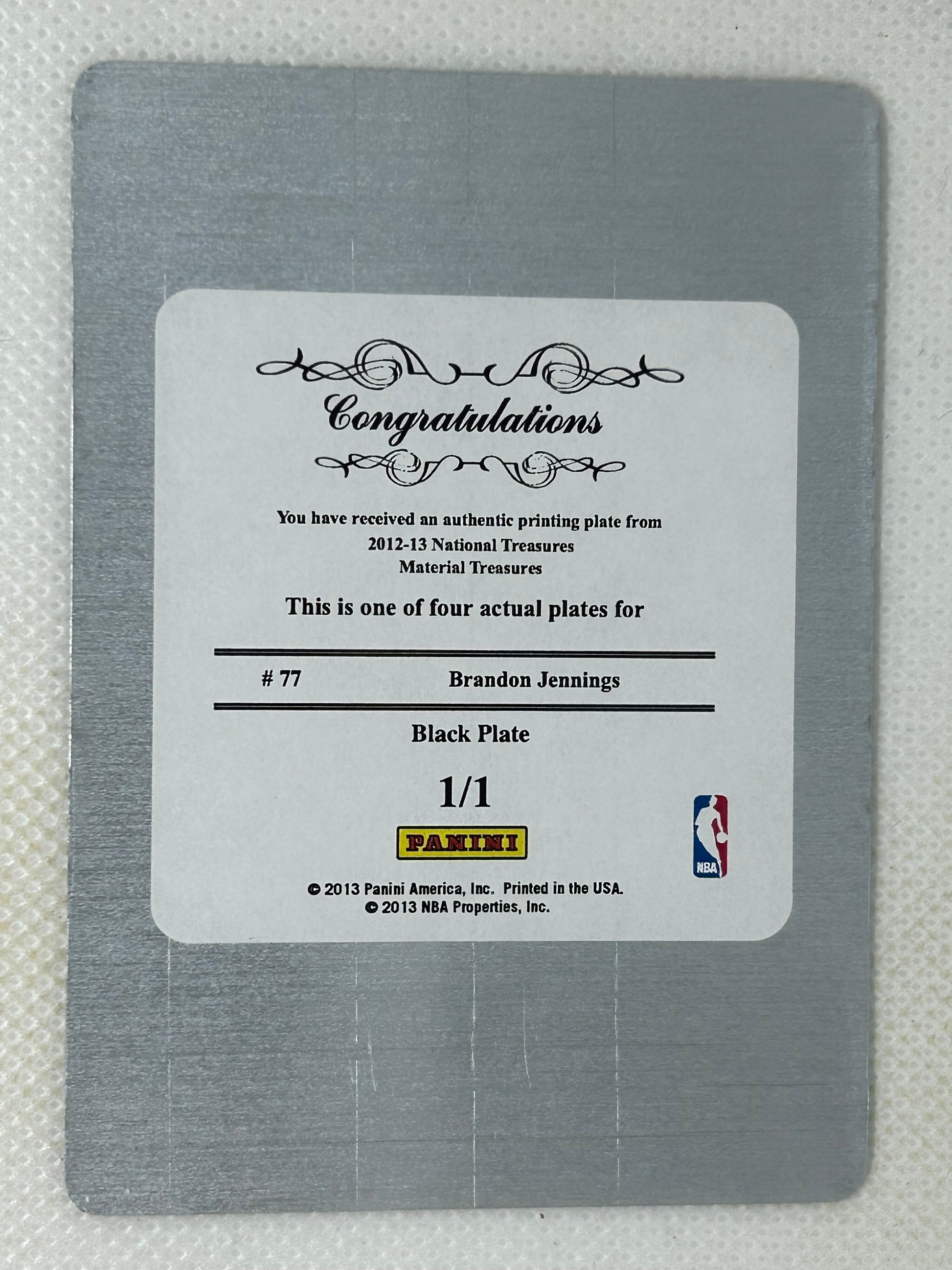 2012-13 Panini National Treasures Material Treasures Printing Plate Black 1/1 Brandon Jennings #77 Milwaukee Bucks