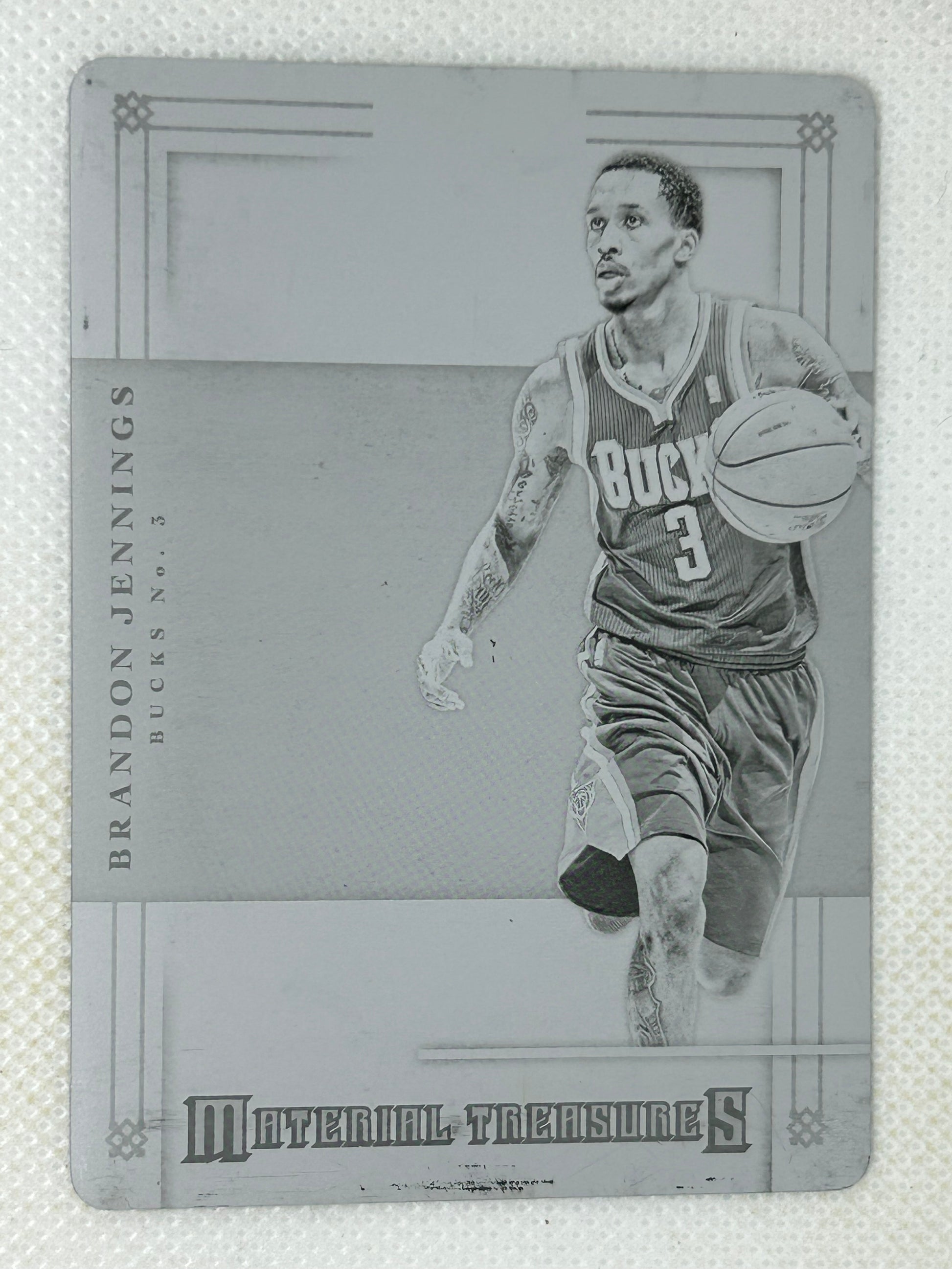 The 2012-13 Panini National Treasures Material Treasures Printing Plate Black 1/1 features Brandon Jennings of the Milwaukee Bucks. Throughout his NBA career, Jennings was recognized for his quick scoring and strong playmaking abilities. As a skilled point guard, he played a crucial role in leading the Bucks' offense and creating opportunities for his teammates. This exclusive printing plate card highlights his impact during that season.