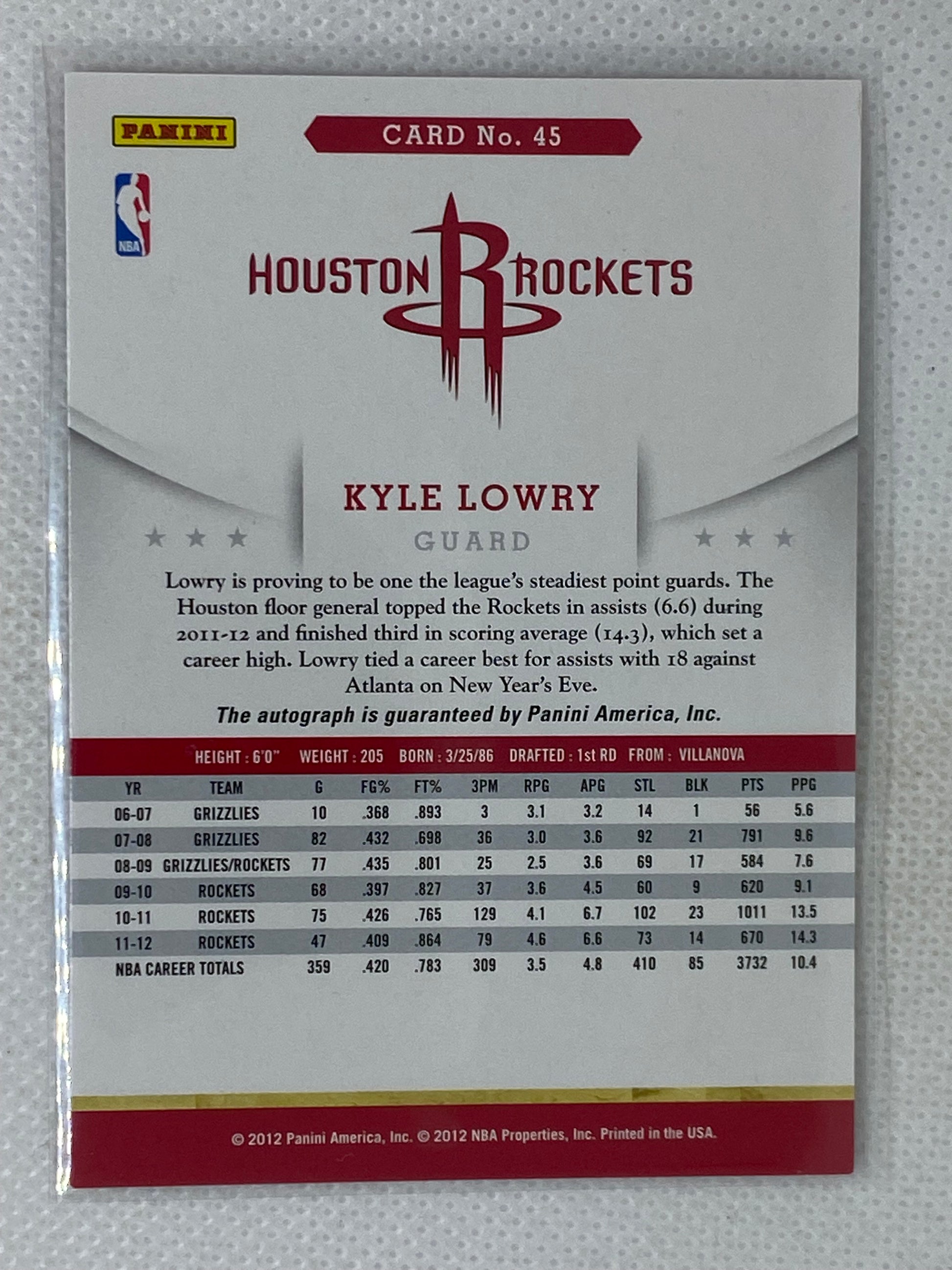 This product is a 2012-13 Panini NBA Hoops Kyle Lowry Autograph #45 Houston Rockets from a merchant with extensive knowledge and expertise in the industry. It features a professional and informative tone, providing accurate information and statistics for the product.