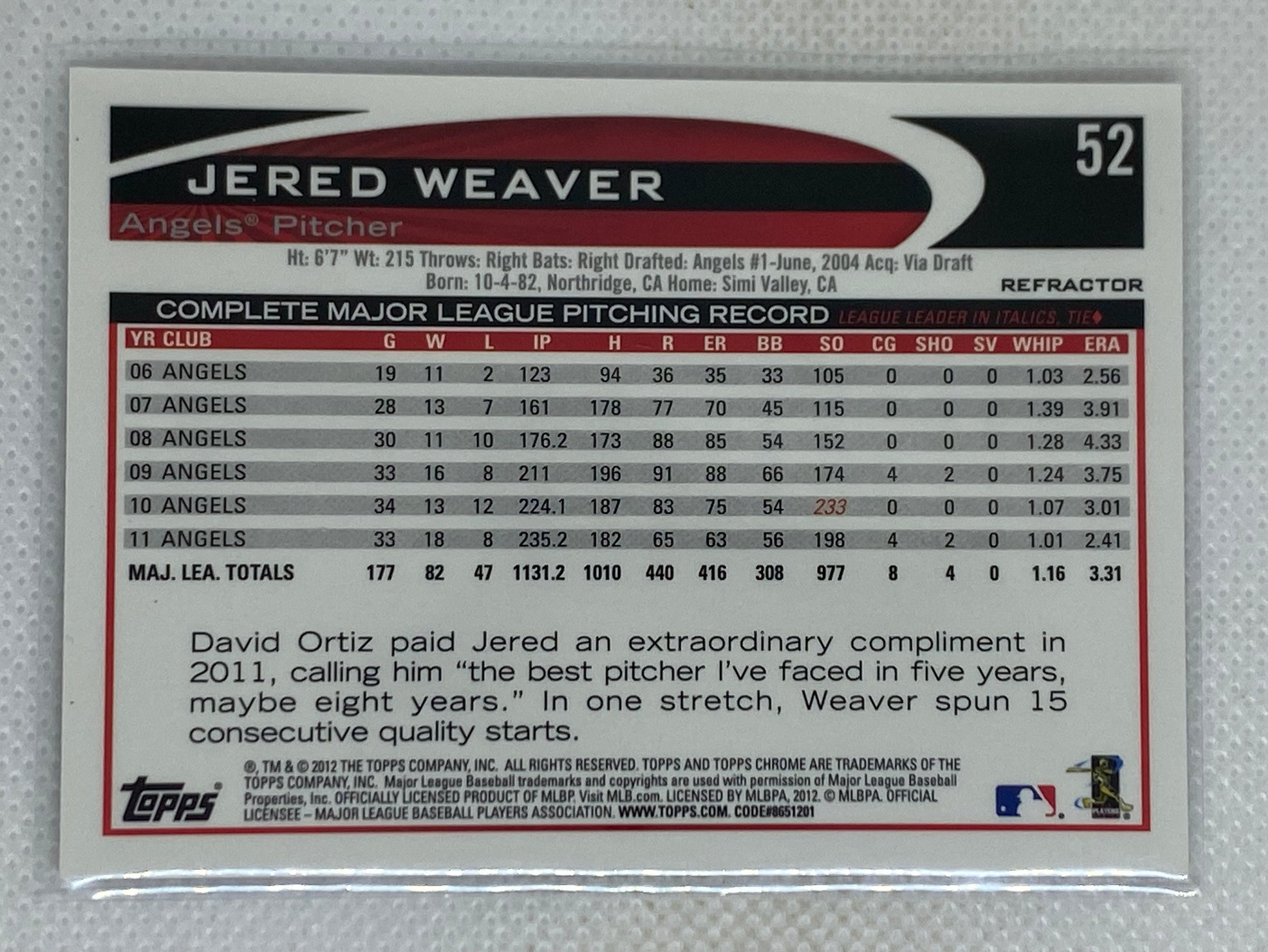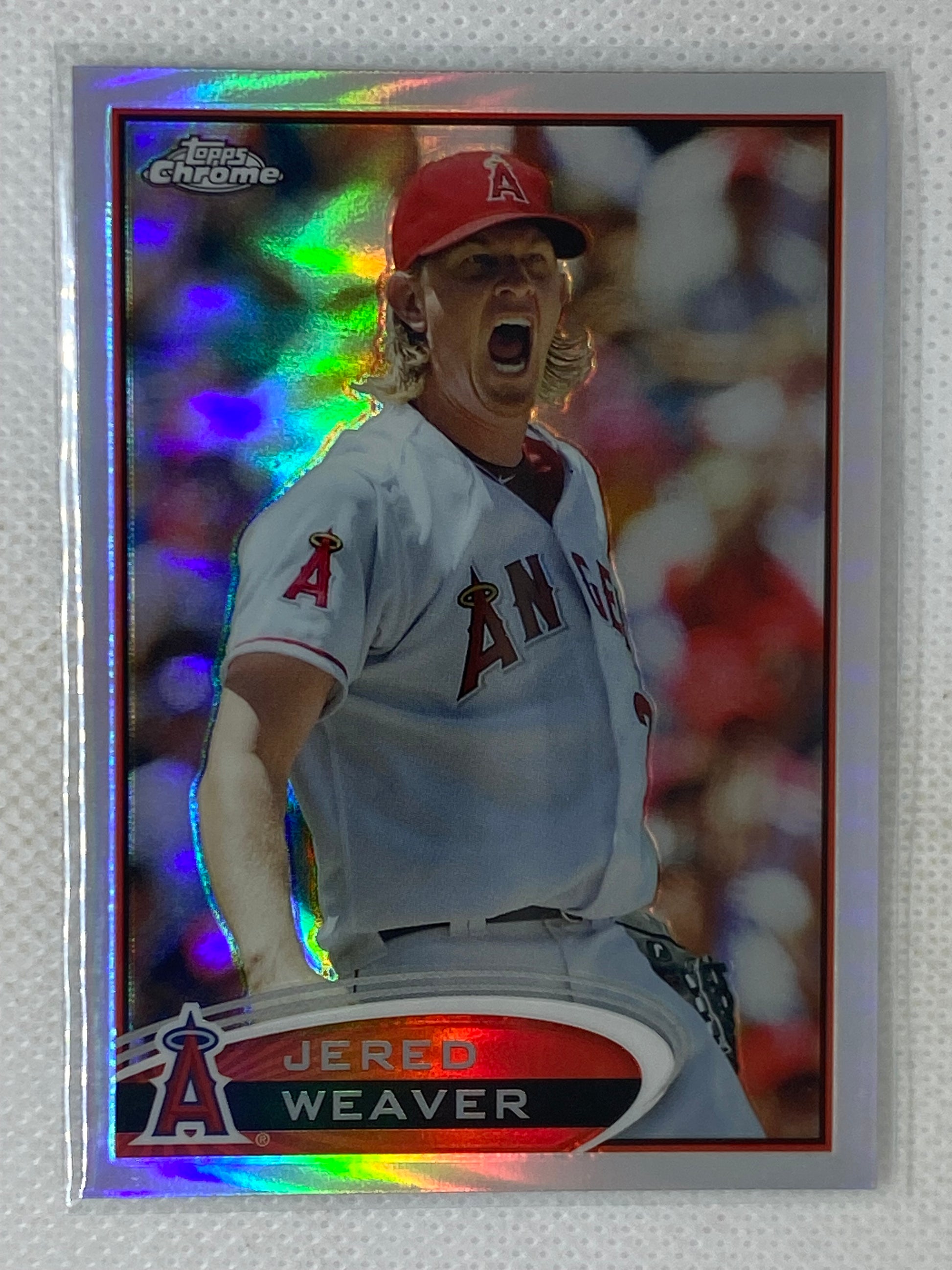 Experience the sleek design and top-quality materials of the 2012 Topps Chrome Refractor #52 featuring Jered Weaver of the Los Angeles Angels.