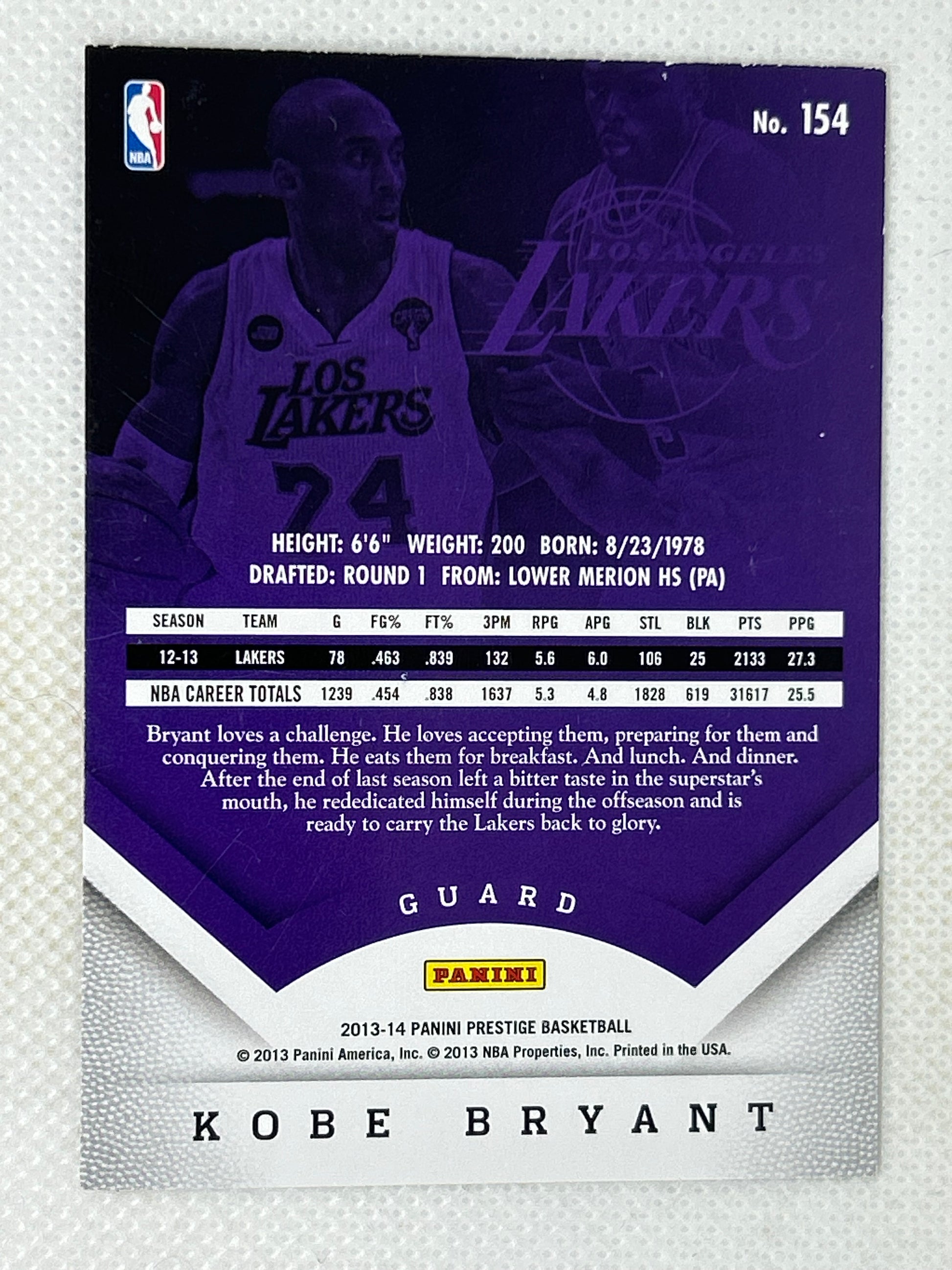 Elevate your sports memorabilia collection with the 2013-14 Panini Prestige #154 Kobe Bryant card. Featuring the legendary Los Angeles Lakers star, this card captures a memorable season of one of basketball’s greatest players. A must-have for fans and collectors looking to enhance their lineup with a piece of NBA history.
