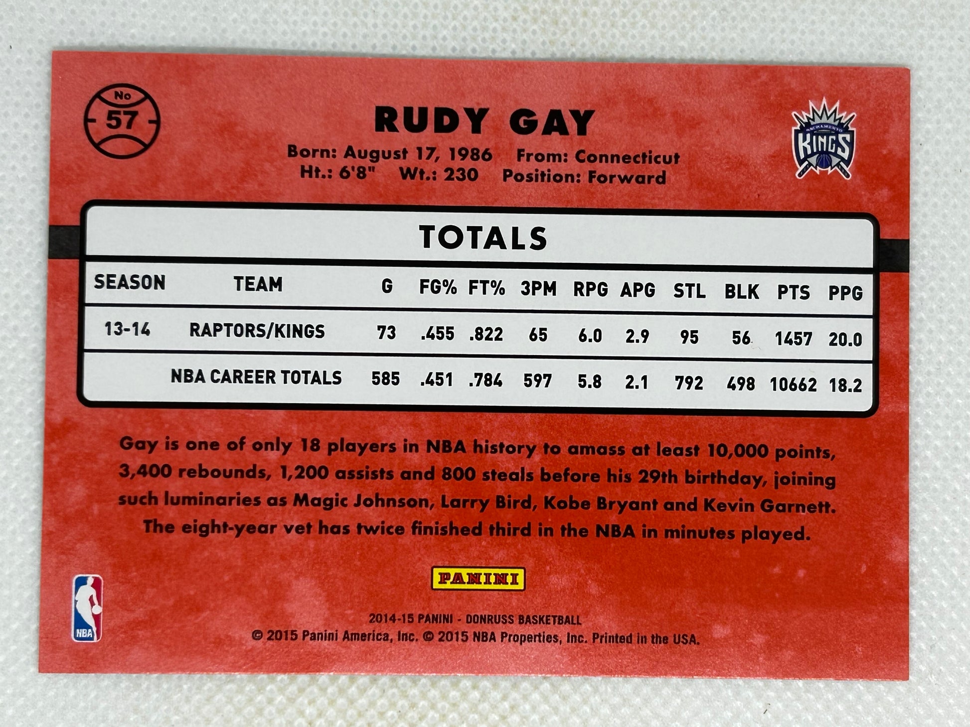 This 2014-15 Panini Donruss card features #57 Rudy Gay, who averages an impressive 20.0 points per game for the Sacramento Kings. Limited to only 200 copies.