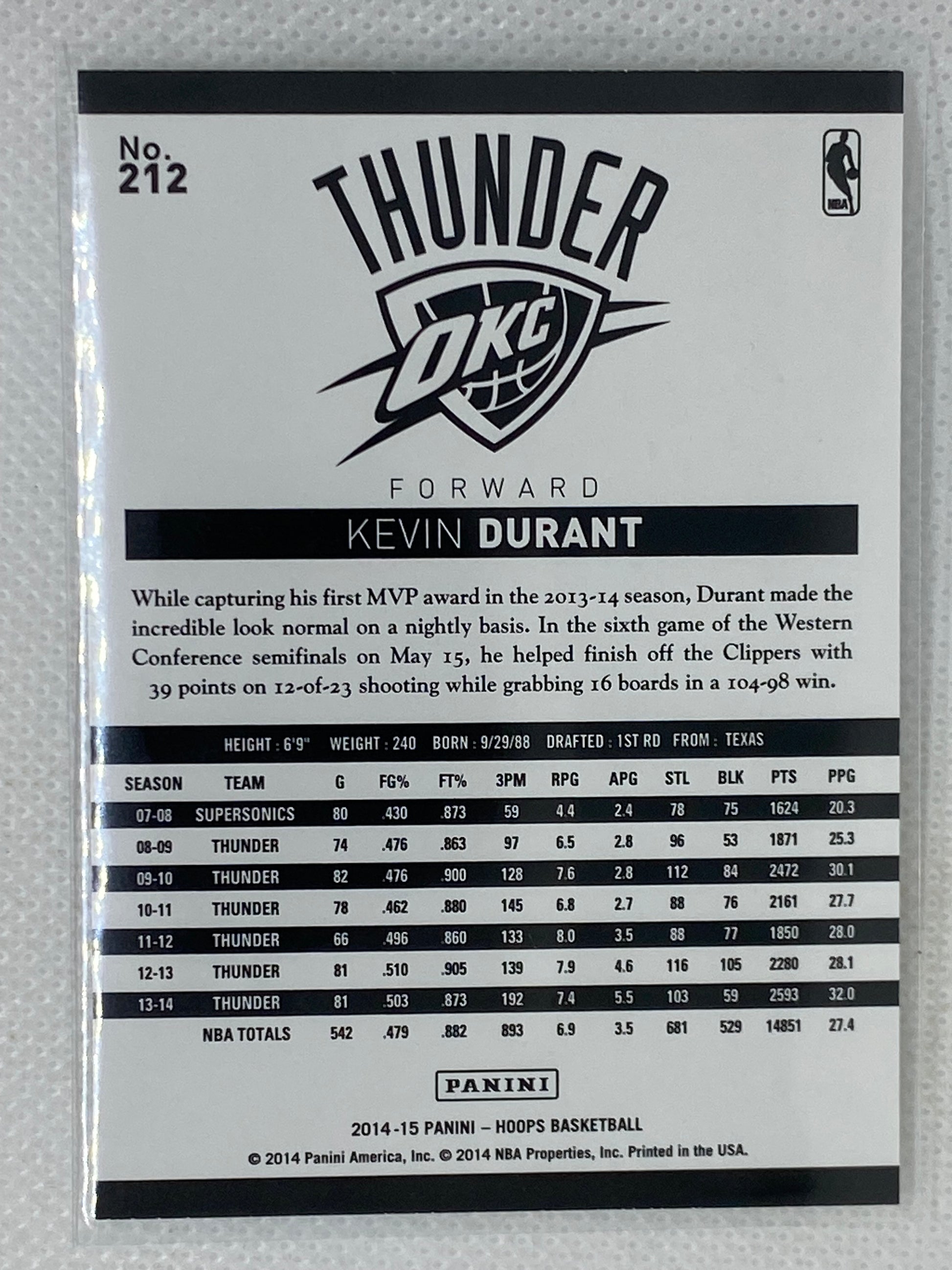 2014-15 Panini Hoops Base Kevin Durant #212 Oklahoma City Thunder