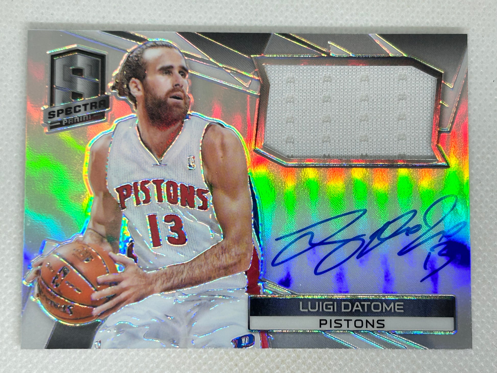 Upgrade your collection with the 2014-15 Panini Spectra Jersey Autographs #28 featuring Luigi Datome of the Detroit Pistons. Limited to 125 copies, this card showcases a distinctive jersey patch alongside an autograph, making it a prized piece for dedicated collectors.