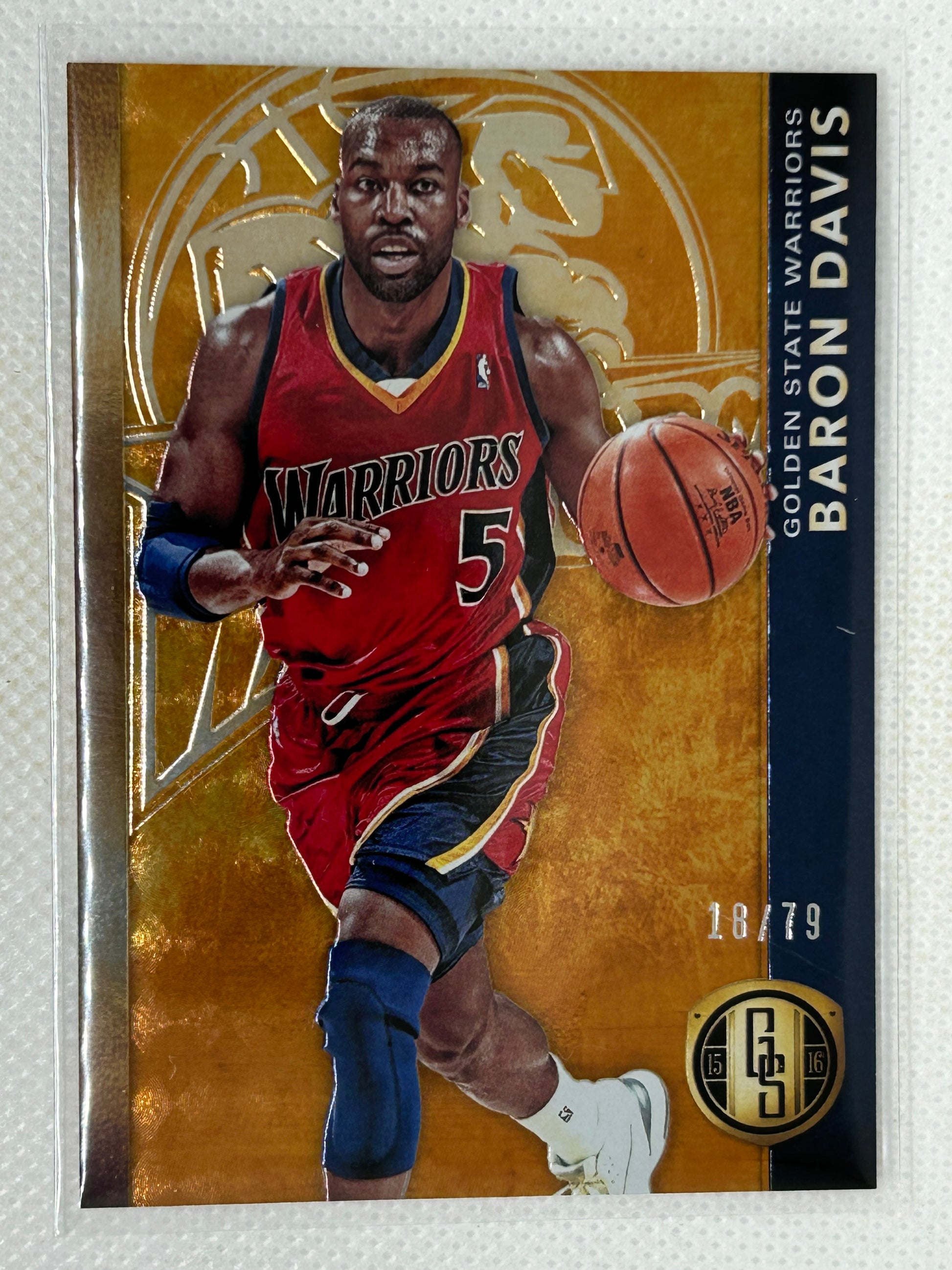 Experience the rare and collectible 2015-16 Panini Gold Standard Insert featuring Baron Davis #159 for the Golden State Warriors. Limited to only 79 prints, this card is a must-have for any basketball fan or collector. Enhance your collection with this exclusive piece of basketball history.