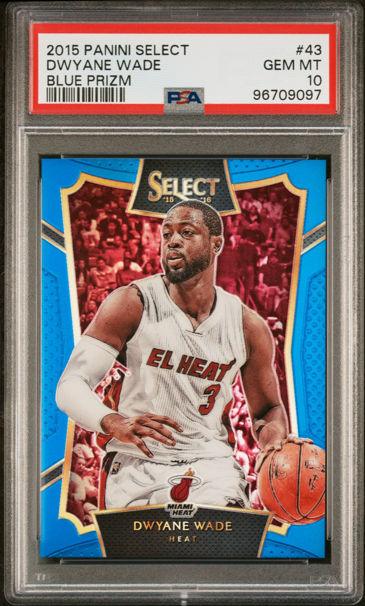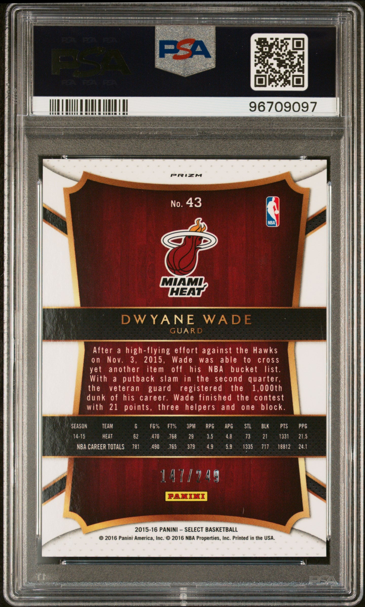 Elevate your career with this 2015-16 Panini Select Blue Prizm Dwyane Wade #43 /249 Miami Heat PSA 10. Own this premium card that features a rare blue prizm design and is graded a perfect PSA 10. Showcase your passion for the game and the Heat with this limited edition collectible.