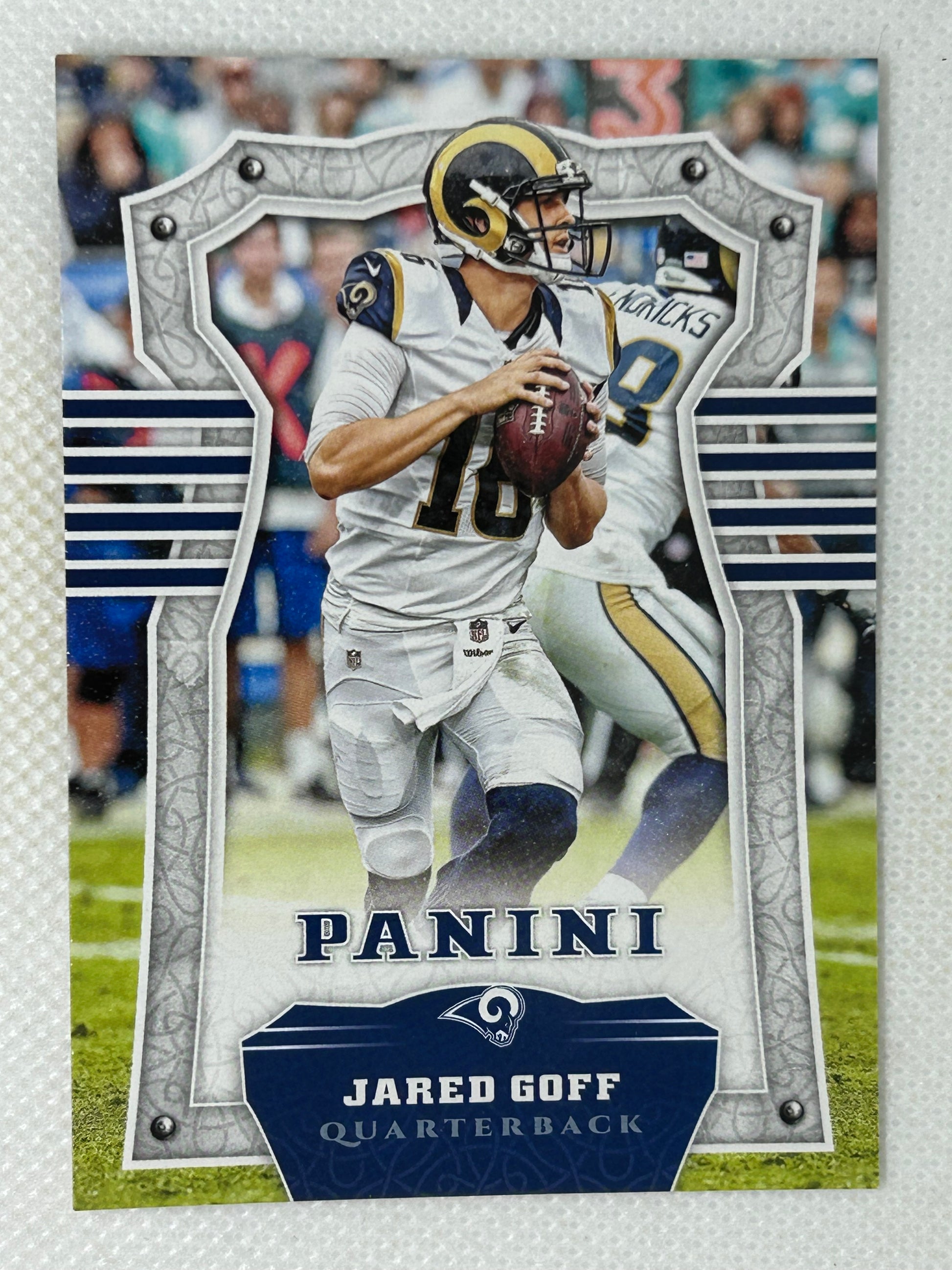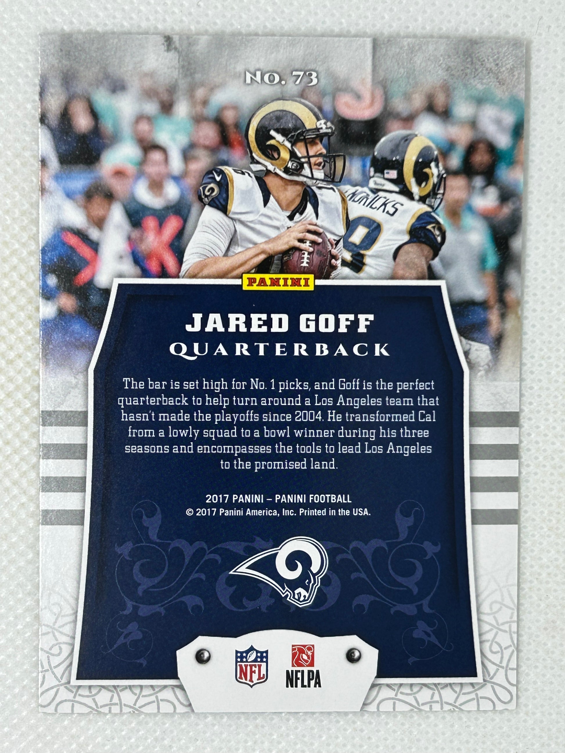 This 2017 Panini Football card #73 features Jared Goff in his early career with the Los Angeles Rams. As the first overall pick in the 2016 NFL Draft, Goff quickly emerged as a promising quarterback, demonstrating strong arm talent and leadership. This card captures the beginnings of a career marked by playoff appearances and significant growth in the league.
