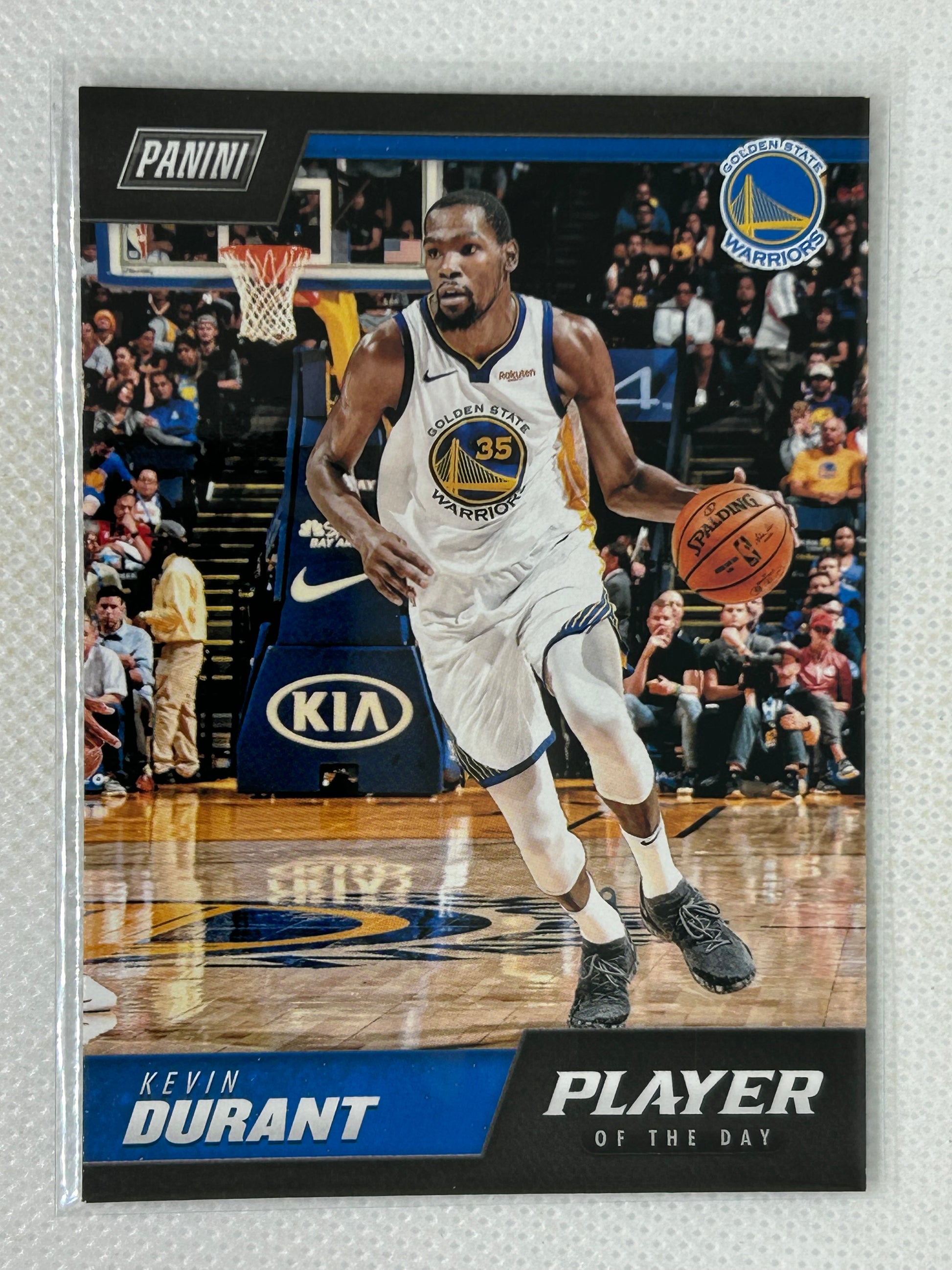 Highlighting the standout player of the day, the 2018-19 Panini Player of The Day card features Kevin Durant of the Golden State Warriors. With a sleek design and Durant's impressive stats, this card is a must-have for any basketball fan or collector.