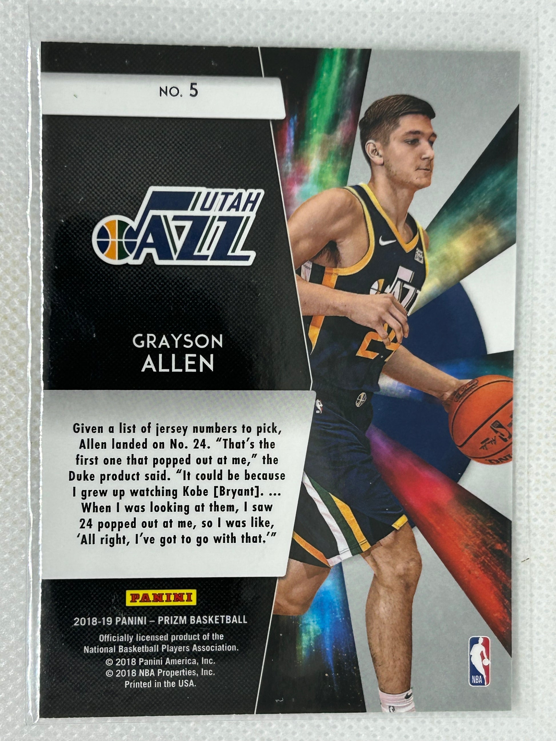 Introduce the newest NBA star with the 2018-19 Panini Prizm Freshman Phenoms Grayson Allen Rookie #5 for the Utah Jazz. This highly collectible card showcases Allen's impressive rookie season with the Jazz, making it a must-have for any basketball fan or collector. Don't miss out on this opportunity to own a piece of sporting history.