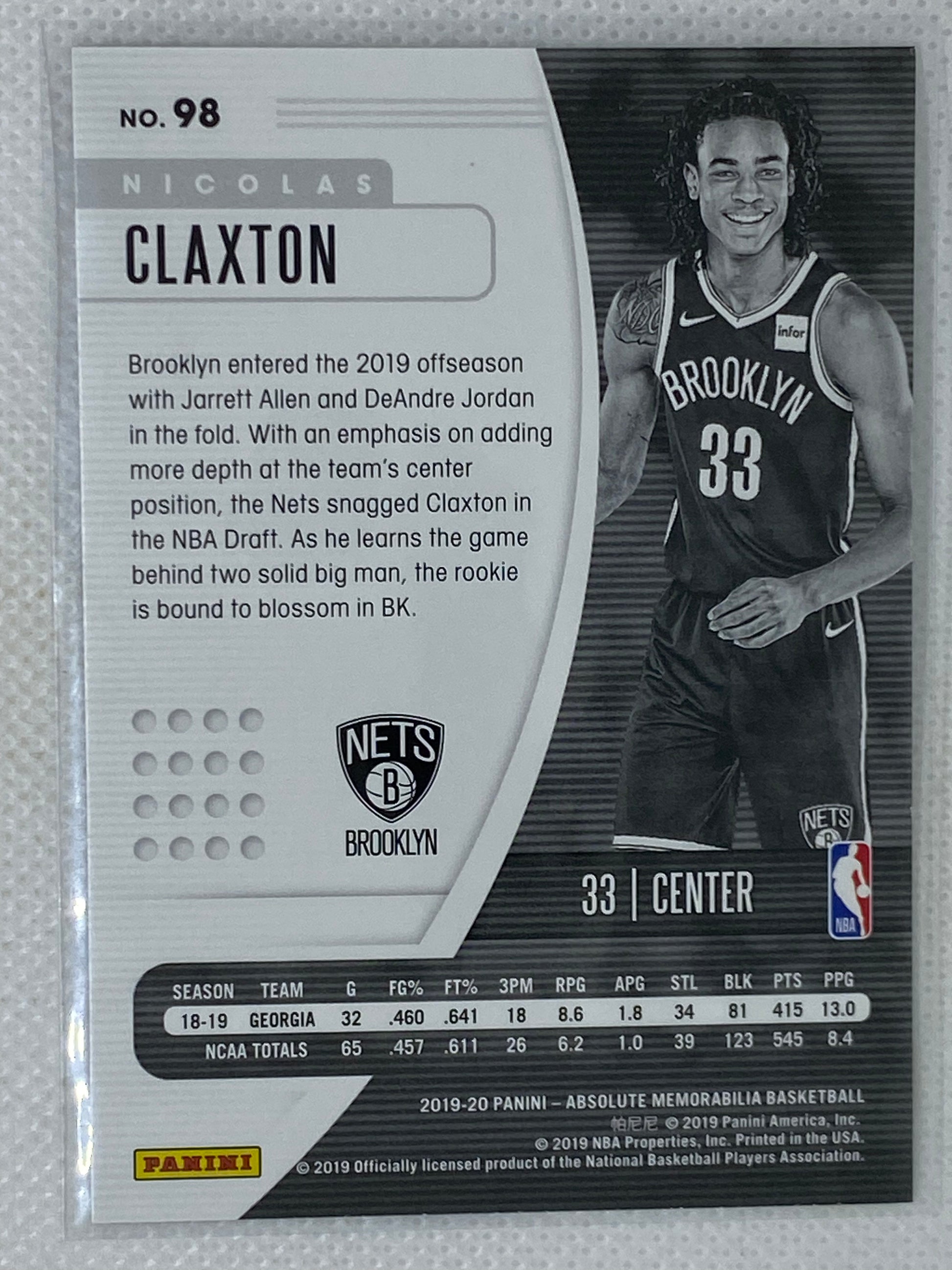 2019-20 Absolute Memorabilia Retail #98 Nicolas Claxton RC Rookie Nets