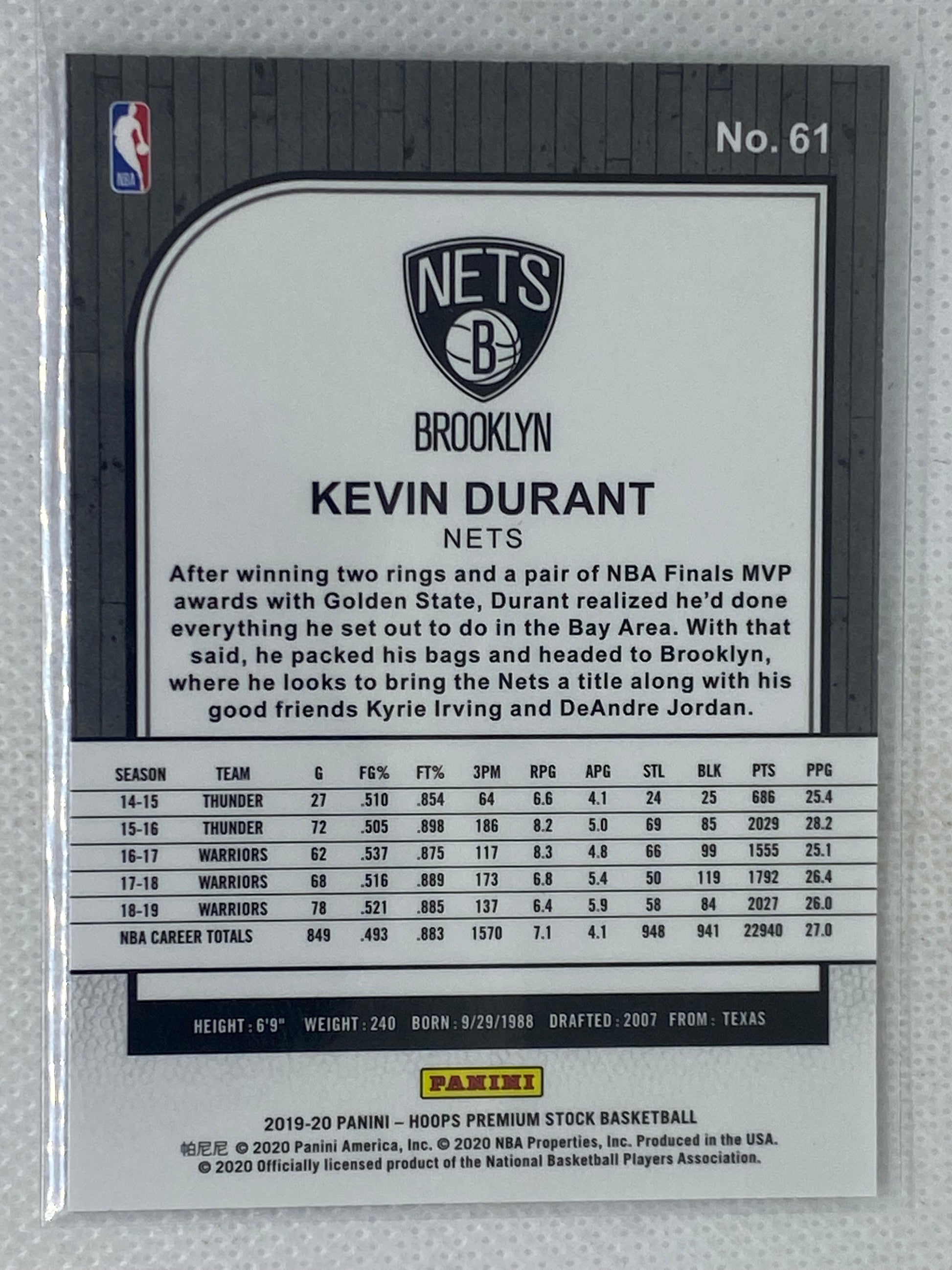 Embrace Durant's Premium Skills! Secure the 2019-20 Panini Hoops Premium #61 card featuring Kevin Durant from his Brooklyn Nets days. This card is a must-have for basketball card enthusiasts. Don't miss out on owning a piece of Durant's excellence with the Nets – make it yours now and elevate your collection!