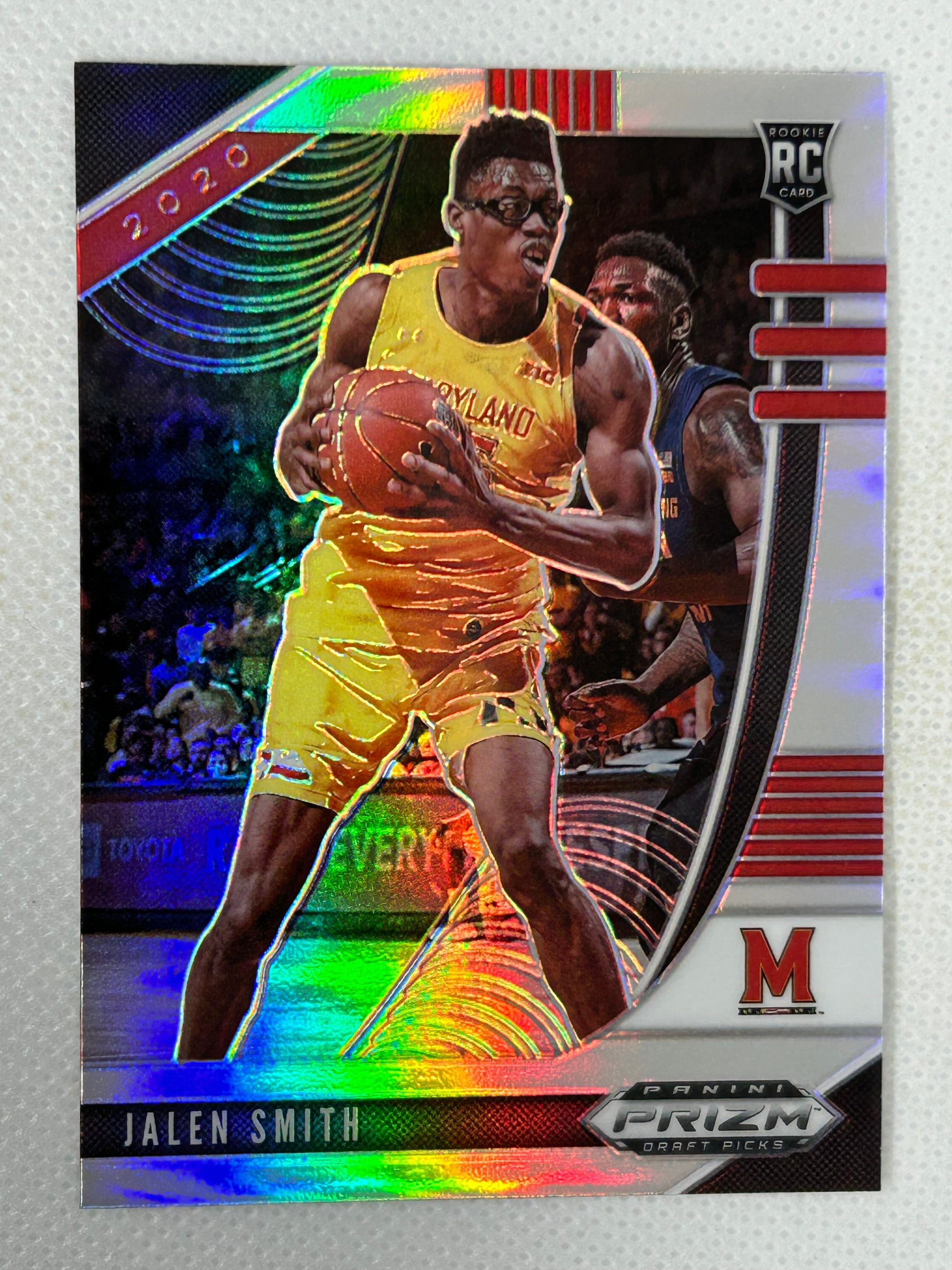 Highlighting the highly anticipated 2020 Panini Prizm Draft Picks Silver Rookie #70 Jalen Smith Maryland Terrapins. With its sleek design and silver finish, this rookie card captures the excitement of a rising star. Add this must-have card to your collection for a potential long-term investment.
