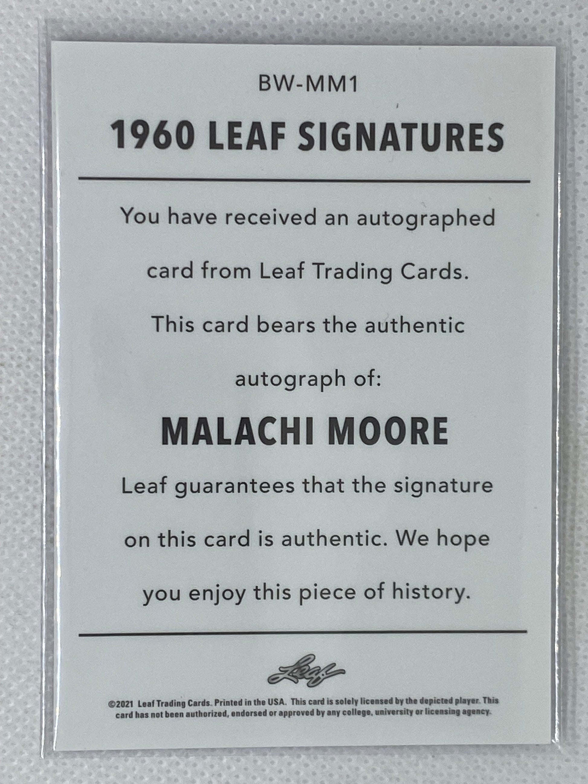 2021 Leaf Memories 1960 Base Purple Spectrum /30 Malachi Moore #BW-MM1 Autograph Alabama Crimson Tide