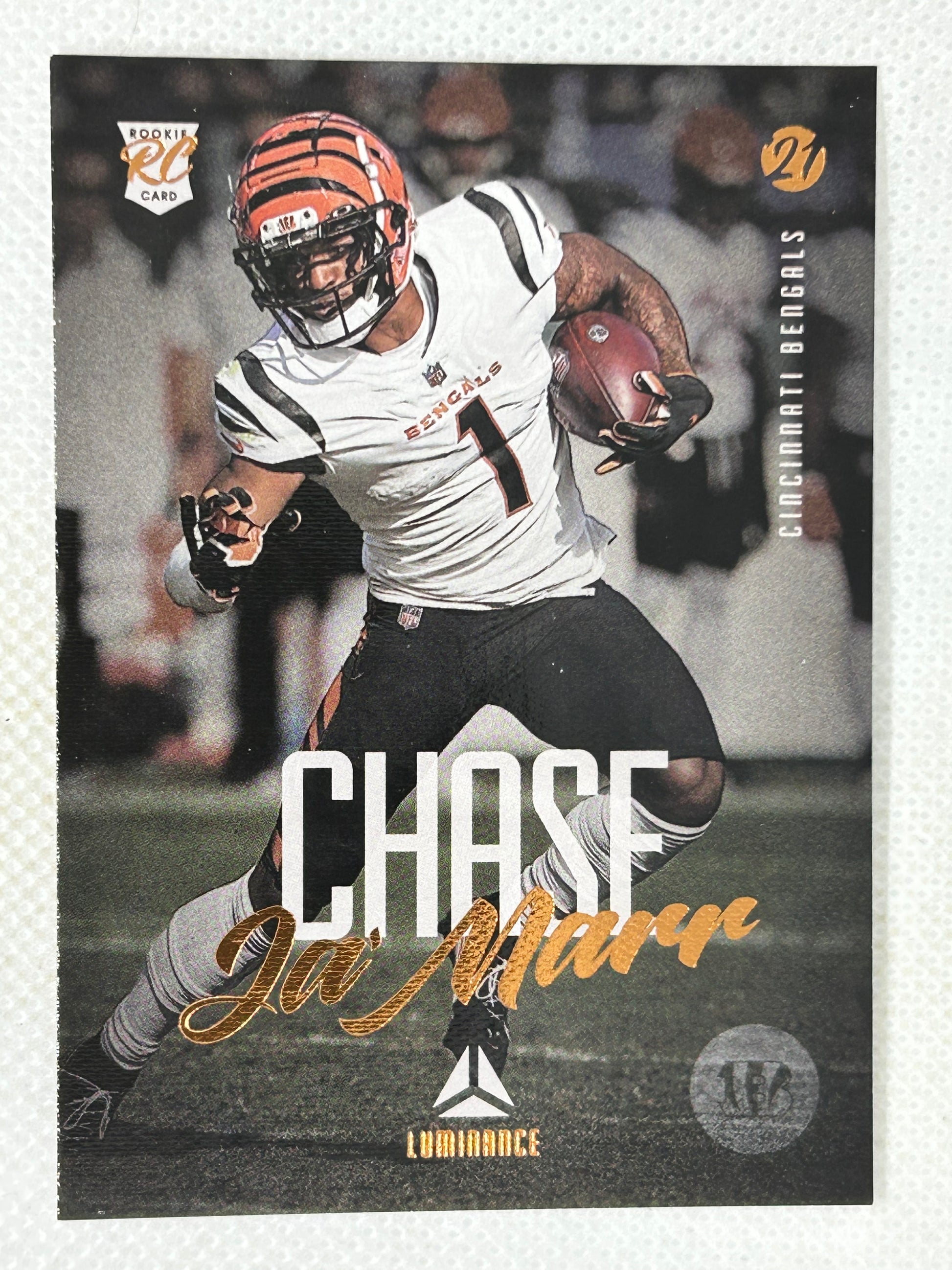 Upgrade your collection with the 2021 Panini Chronicles Luminance Bonze Rookie #212 Ja'Marr Chase Cincinnati Bengals. This exclusive card offers a stunning design and highlights the talented wide receiver, making it a must-have for any football fan.