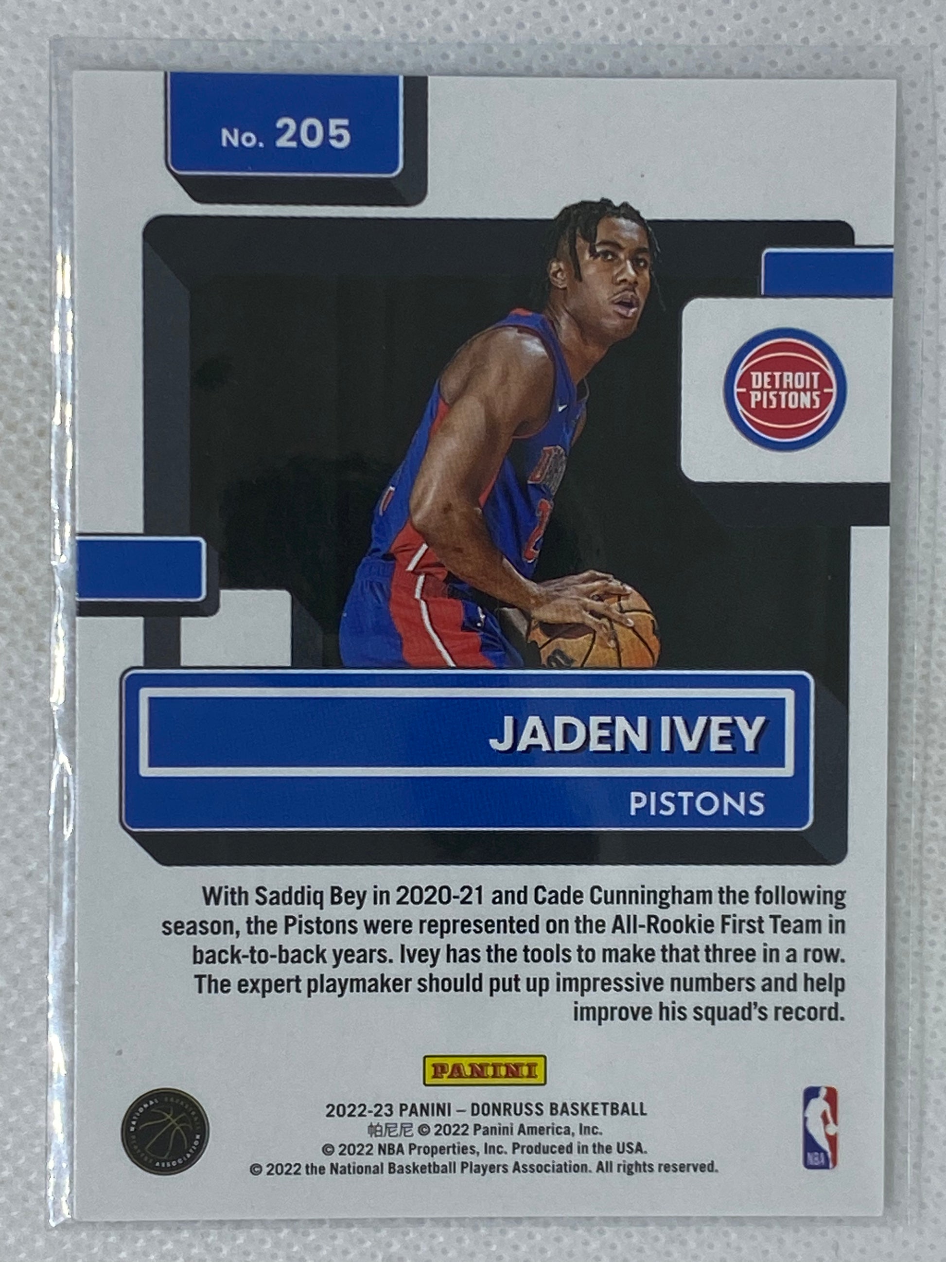 2022-23 Panini Donruss Jaden Ivey Rated Rookie Base Card RC Detroit Pistons #205