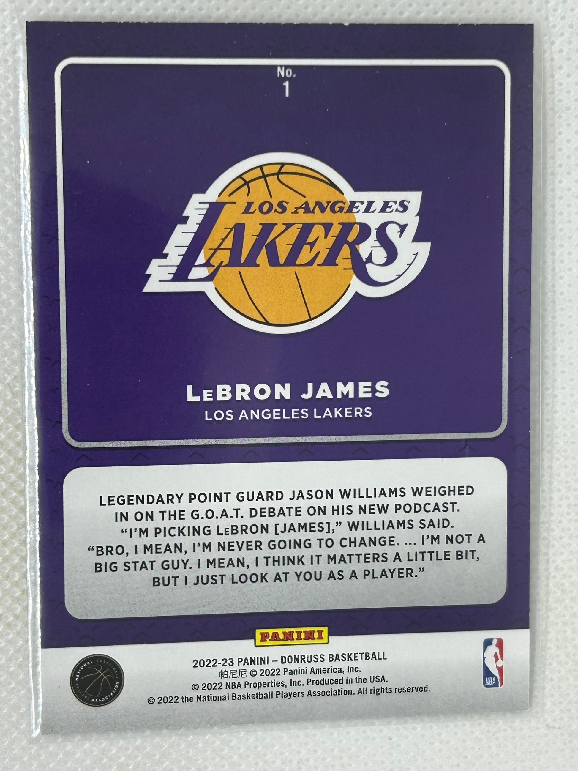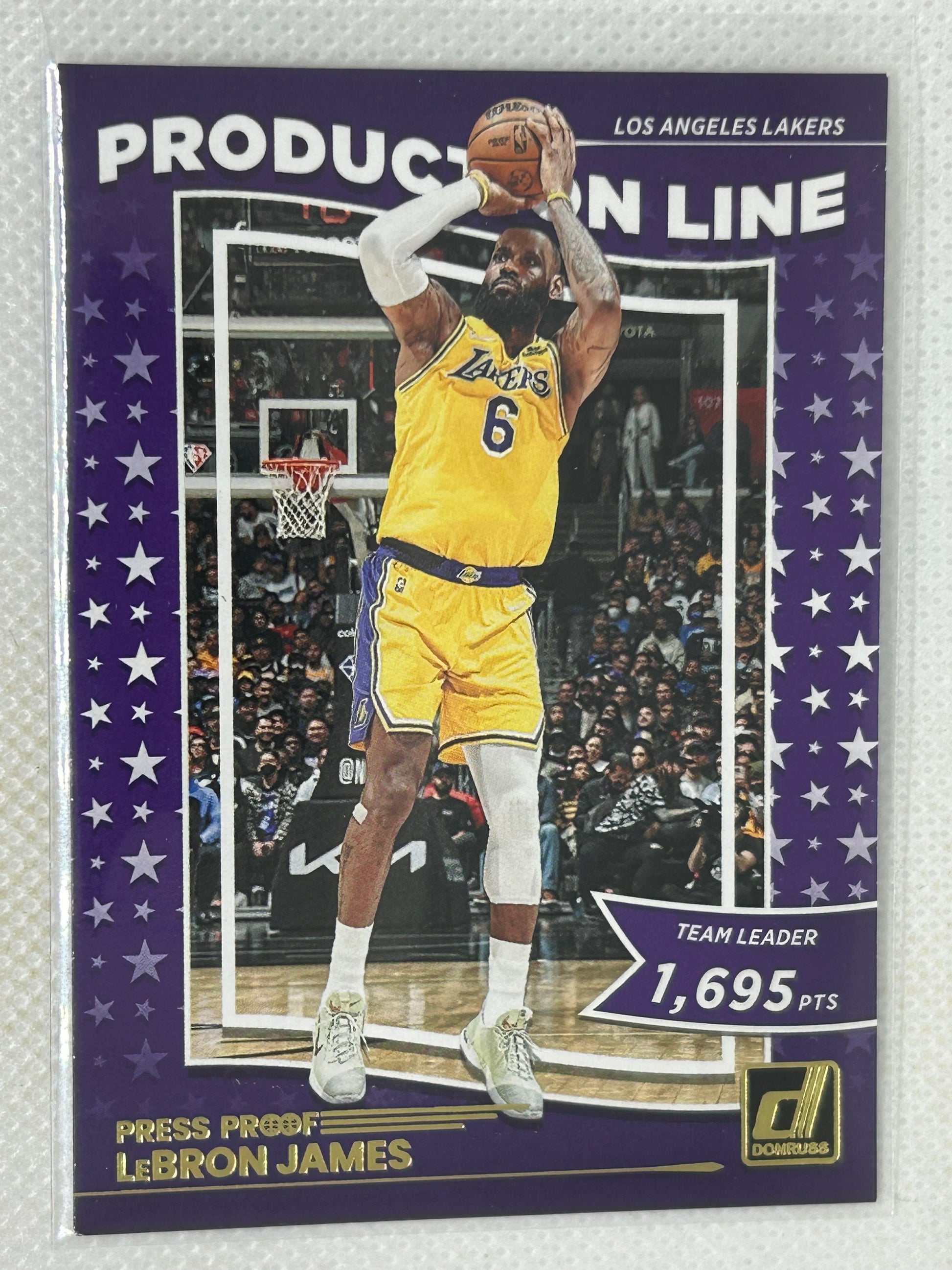 Improve your collection with the 2022-23 Panini Donruss Production Line Gold Press Proof #1 featuring LeBron James of the Los Angeles Lakers.
