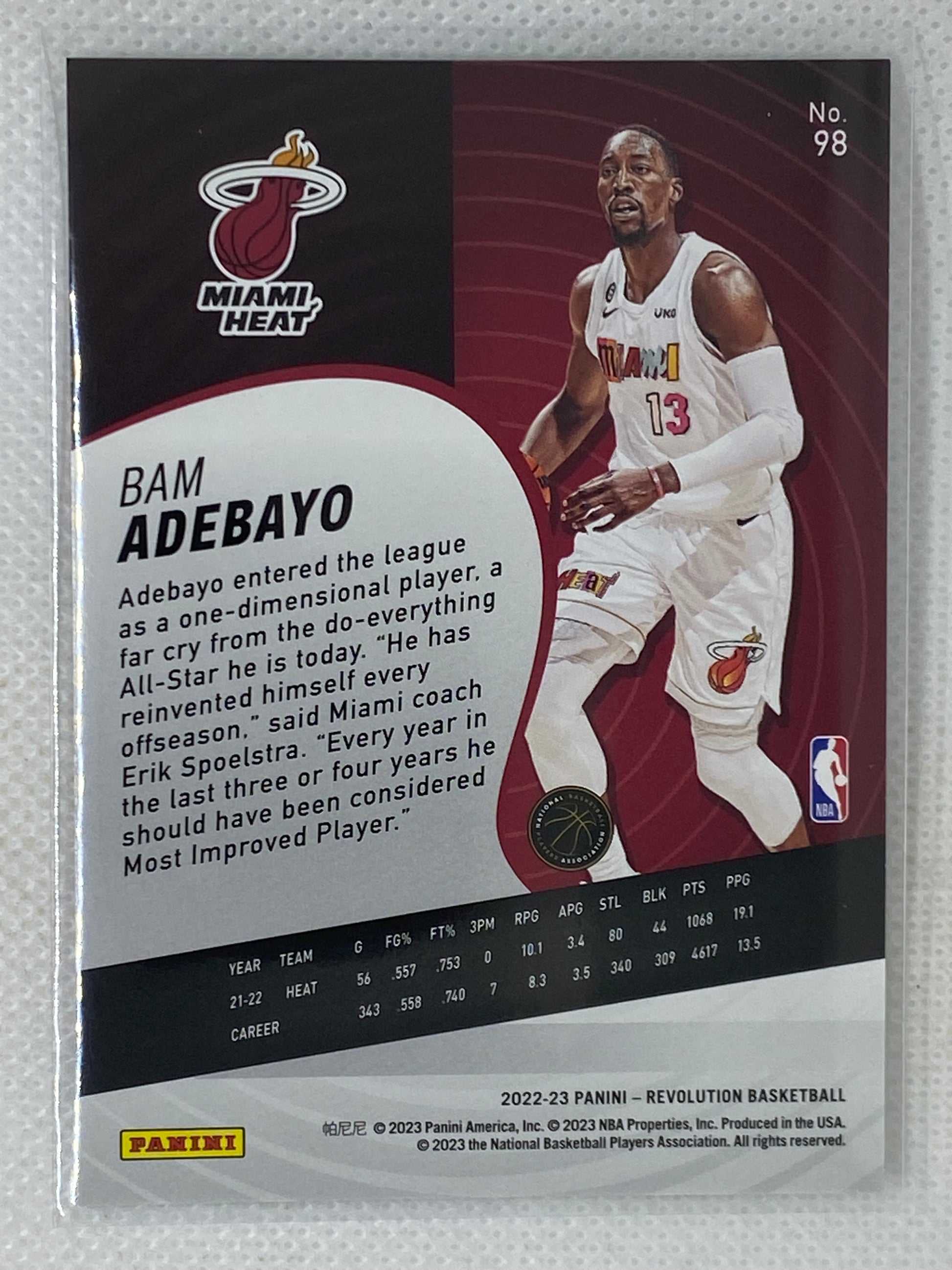 Own a Piece of Miami Heat History! Get the 2022-23 Panini Revolution Basketball Base #98 featuring Bam Adebayo. Don't miss out – add this star player's card to your collection today!