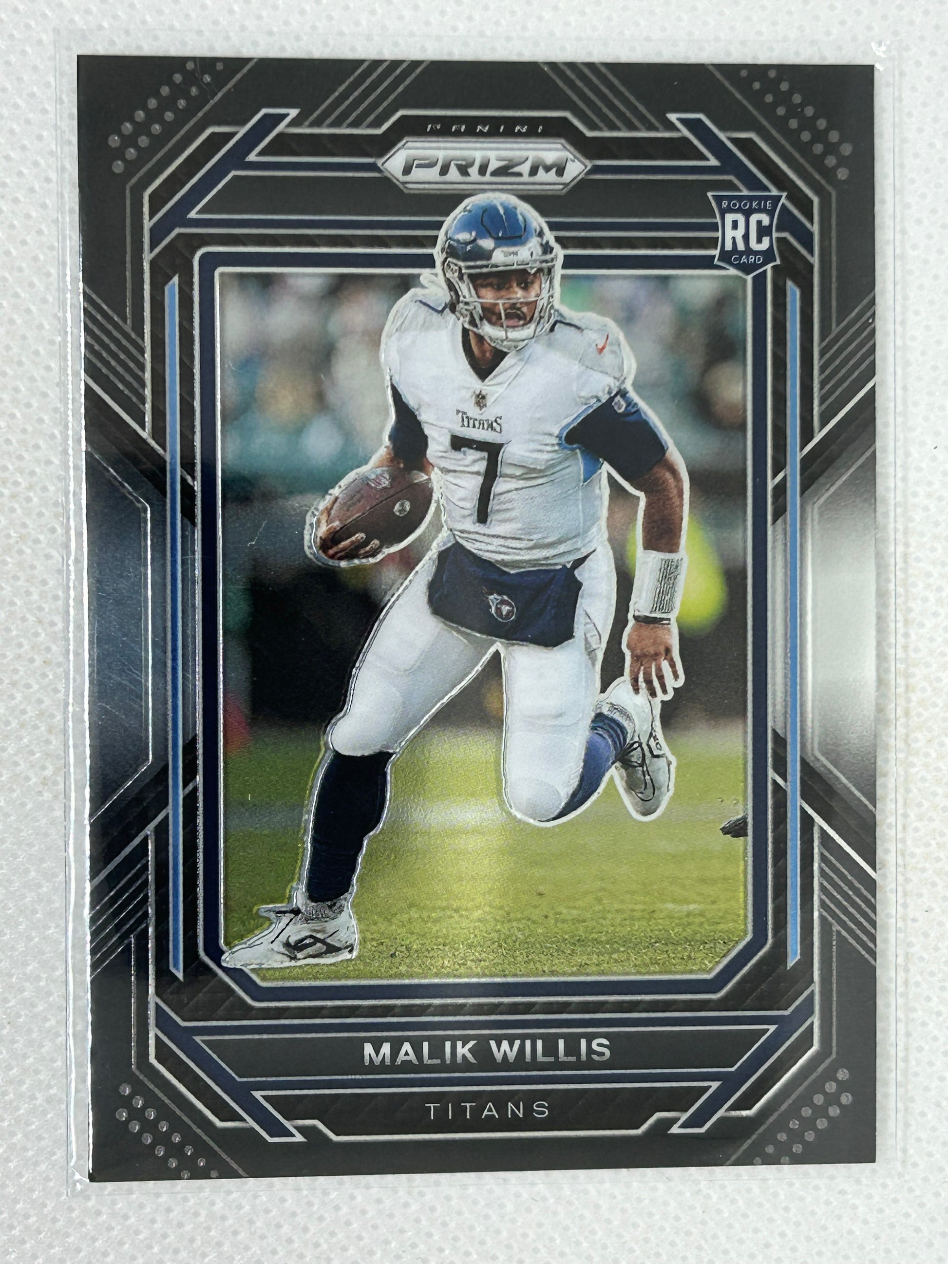 Introducing the 2022 Chronicles Prizm Black Malik Willis Prizm Rookie #PB7 Tennessee Titans. This highly coveted trading card features the promising young quarterback, boasting the exclusive Prizm technology and black design. Don't miss out on the chance to add this rare gem to your collection.
