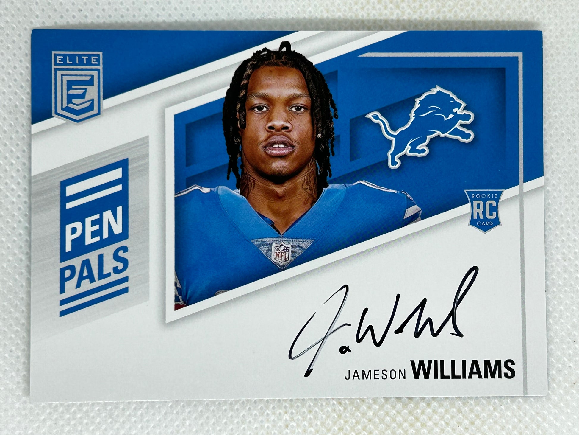 Elevate your Sports Card collection with the 2022 Panini Donruss Elite Pen Pals Horizontal Rookie Autograph #PPV-JW featuring Jameson Williams of the Detroit Lions, a highly sought-after SSP.