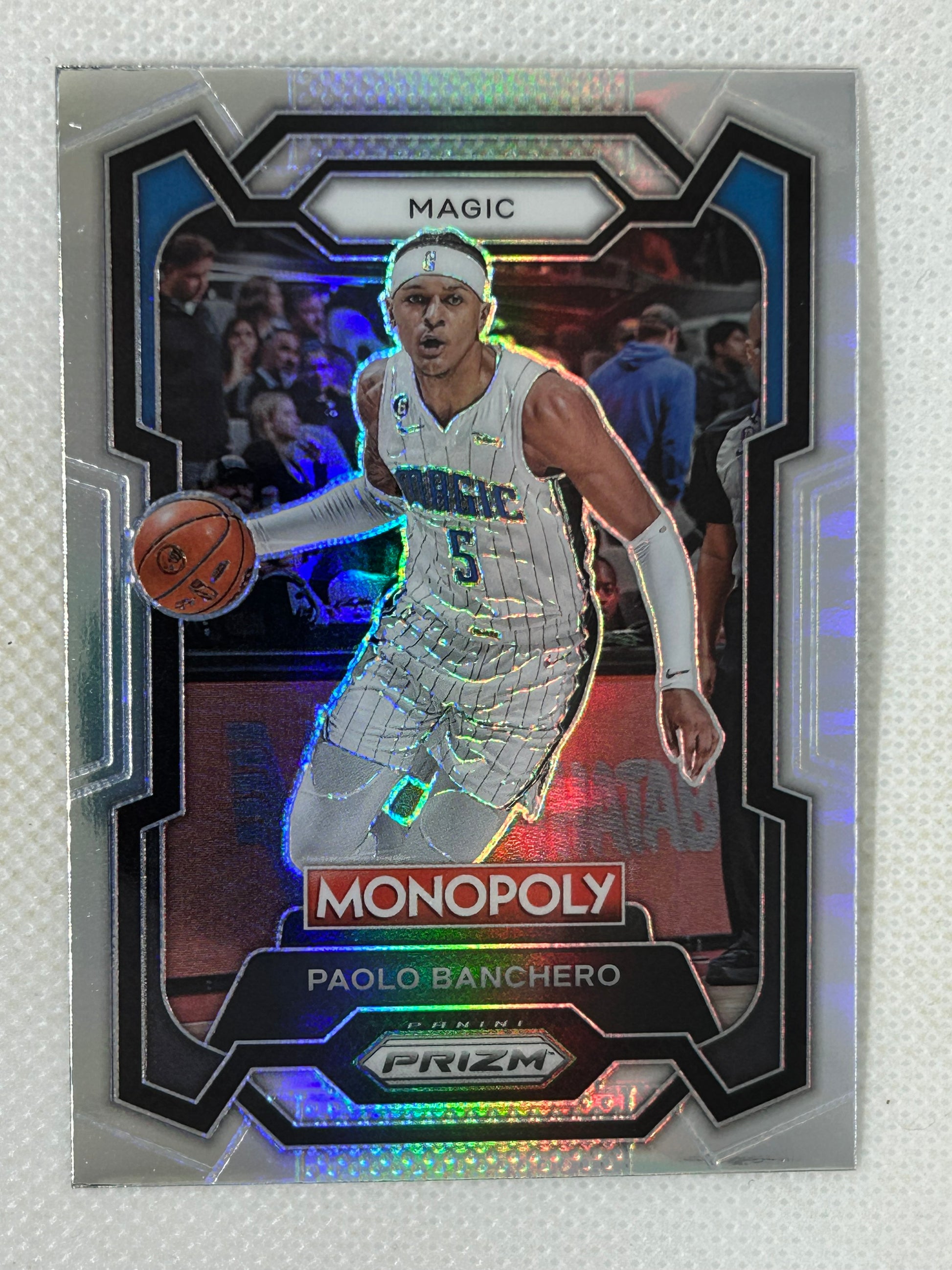 This addition to your collection is the 2023-24 Panini Prizm Silver Monopoly #64 Paolo Banchero of the Orlando Magic, guaranteed to enhance your assortment.