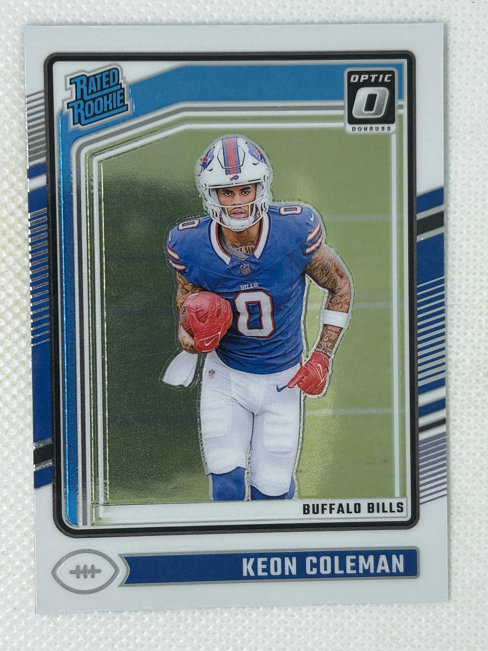 The 2024 Panini Donruss Optic Rated Rookie Keon Coleman #263 card highlights the promising start of Keon Coleman’s professional football career with the Buffalo Bills. Known for his athleticism and versatility, Coleman brings energy and skill to the field as he works to establish himself in the NFL. This rookie card captures the beginning of his journey as he aims to make a significant impact at the next level.