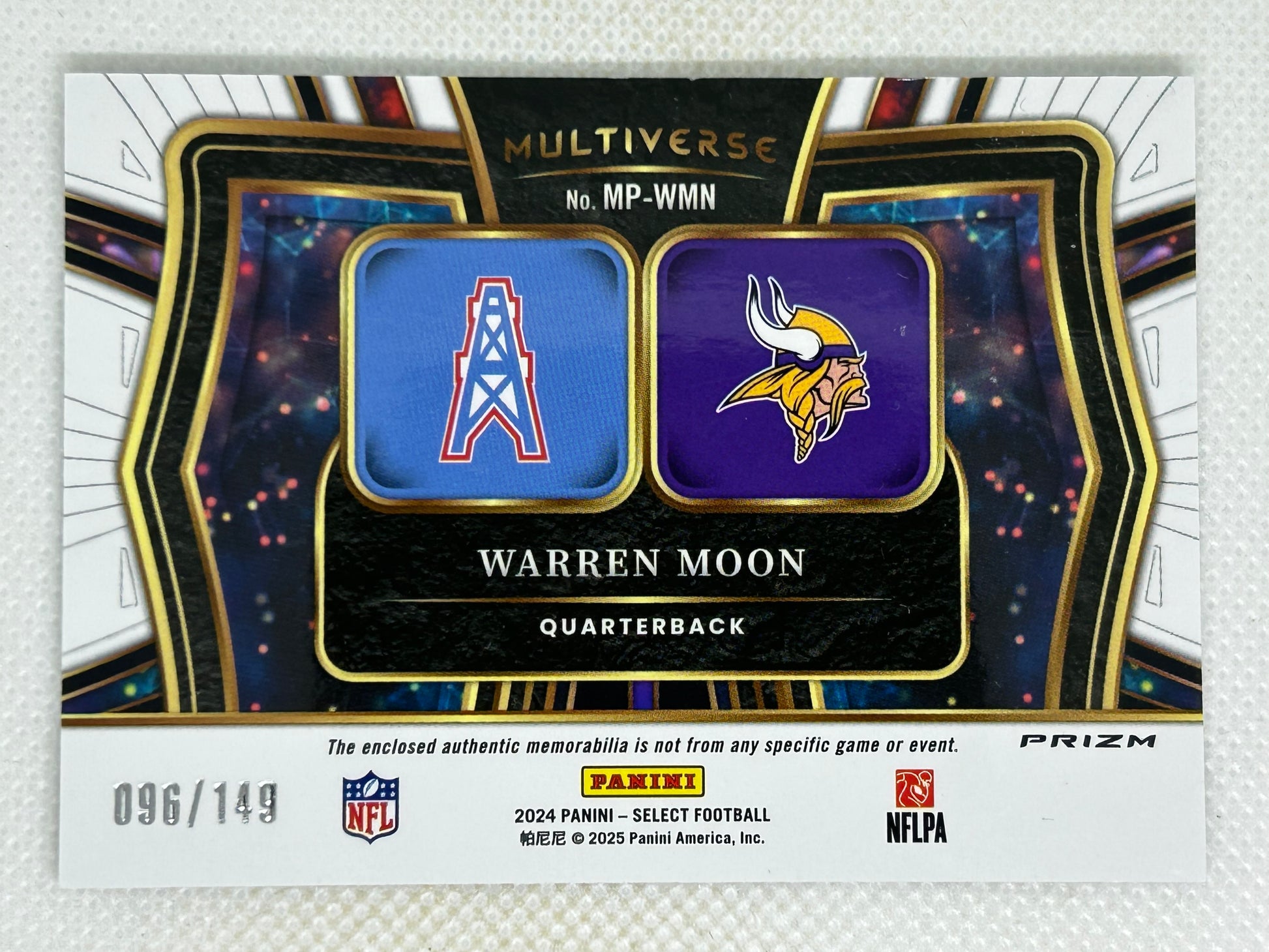 2024 Panini Select Multiverse Silver Prizm Dual Relic Warren Moon /149 #MP-WMN Houston Oilers Minnesota Vikings Signed Card