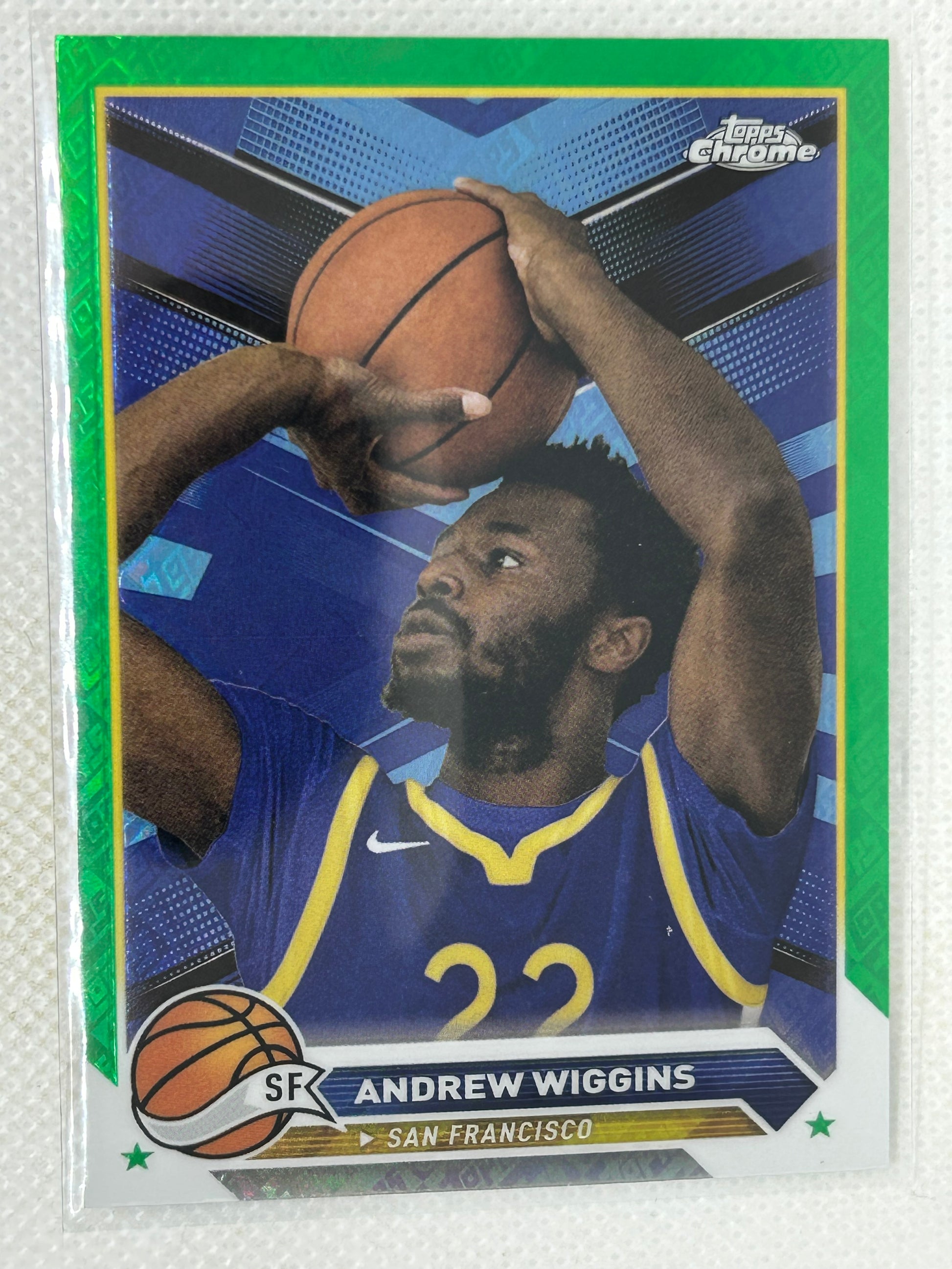 2024 Topps Chrome Basketball Green Topps Refractor Andrew Wiggins #28 adds a rare and highly sought after Green Refractor to your collection. Emphasizing the brilliance of the Golden State Warriors star, this card is a must-have for any collector looking to elevate their basketball card collection.
