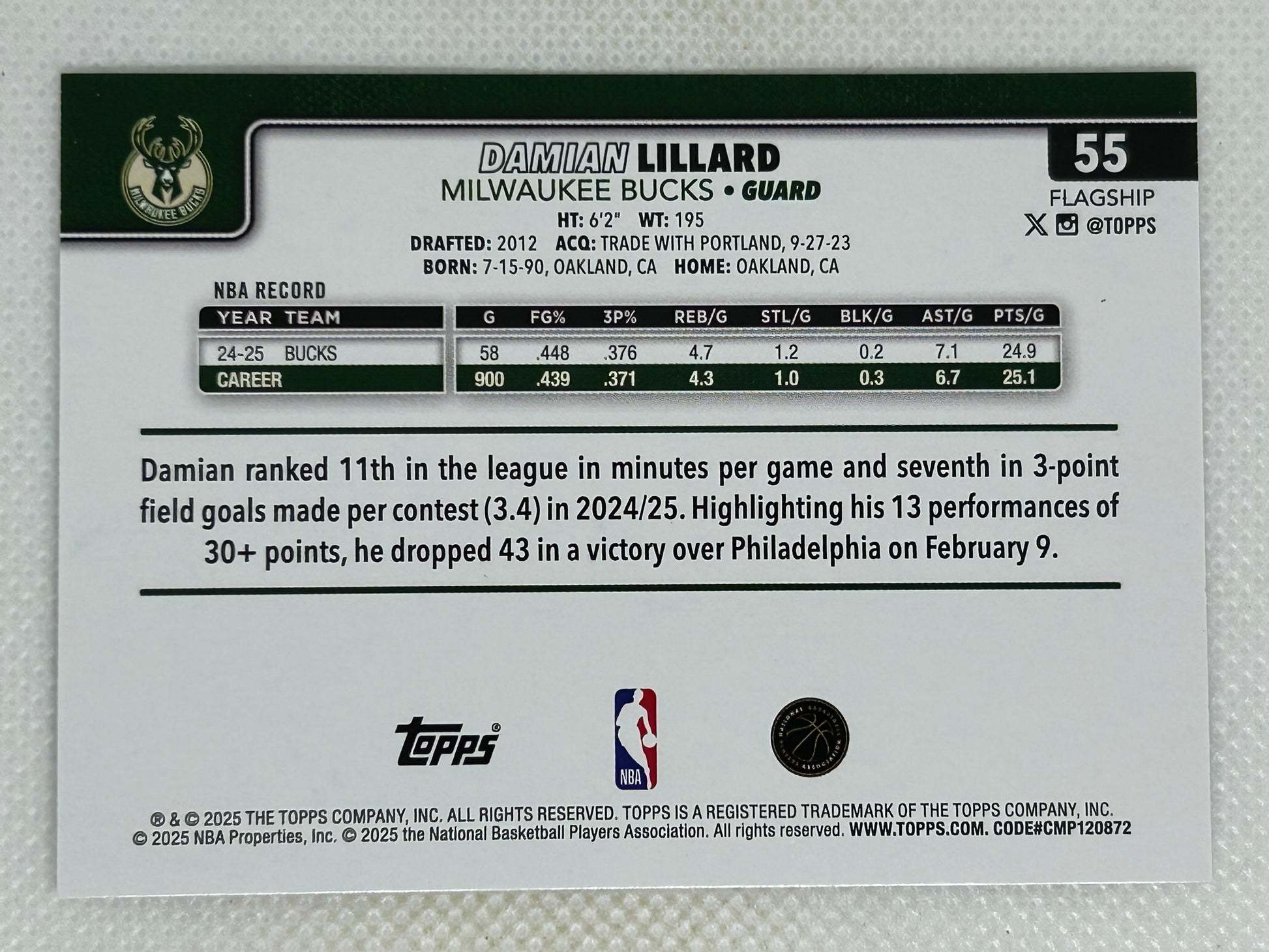 Damian Lillard's legendary career reaches a defining moment with his arrival in Milwaukee, and this 2025-26 Topps Silver Diamanté card (#55) celebrates his transformative impact on the Bucks' championship window. The elite point guard brings decades of NBA excellence and clutch performances to a franchise hungry for a title contender. This premium Silver Diamanté edition captures Lillard during a crucial season where his veteran leadership and scoring prowess position the team as serious Eastern Conference threats. Limited in production and graded for authenticity, this collectible documents one of the league's most accomplished guards at a pivotal chapter in his storied career, making it an essential piece for Bucks fans and serious memorabilia collectors alike.