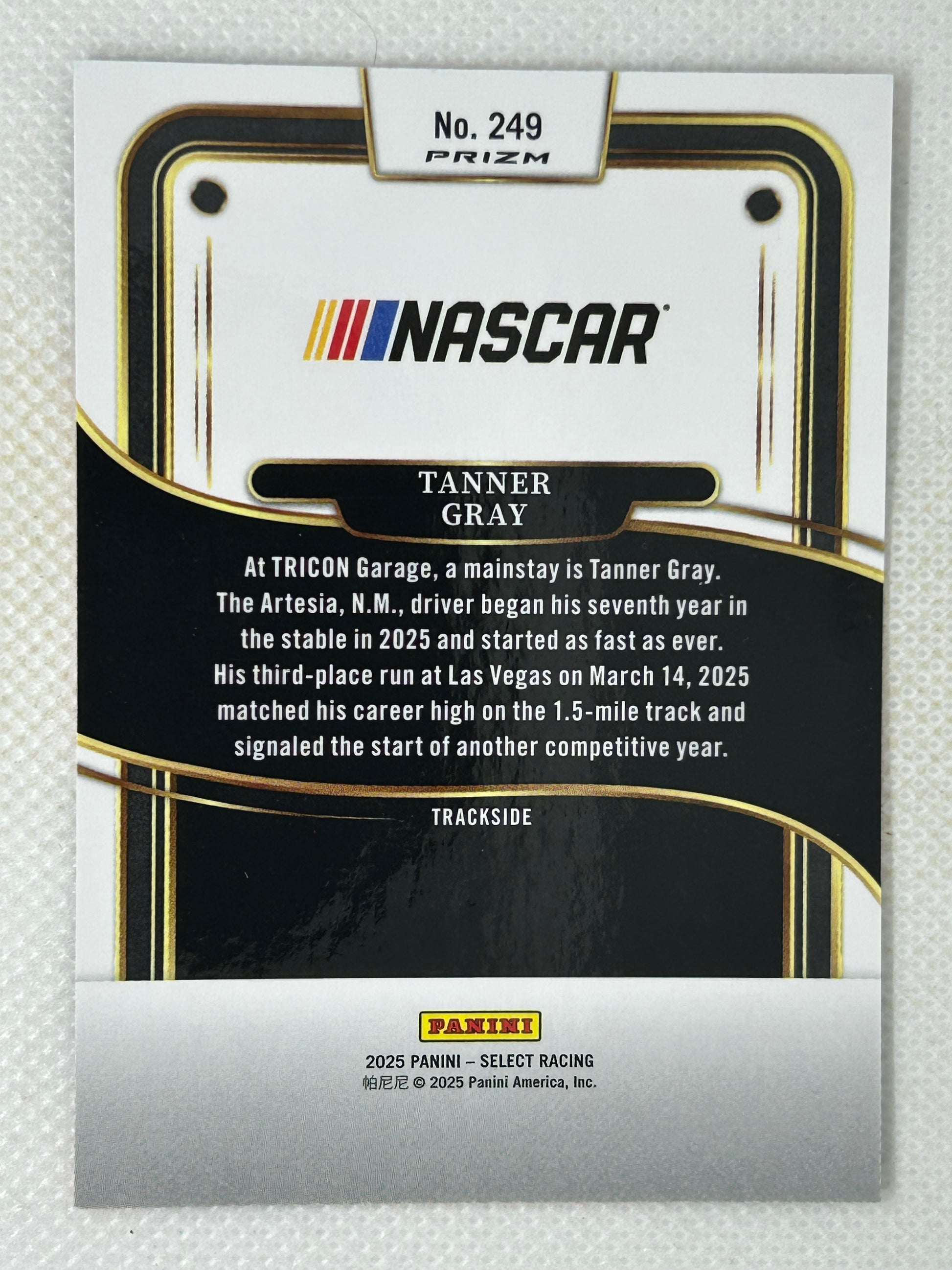 Tanner Gray's 2025 Panini Select Trackside Orange Shimmer card captures a pivotal moment in his racing career. This #249 card features an authentic signature and the eye-catching orange shimmer finish that collectors prize. Gray's rise through the motorsports ranks showcases his dedication and skill behind the wheel, making this signed card a meaningful addition to any collection. The Trackside series highlights drivers making their mark in the sport, and this piece commemorates Gray's journey as he continues building his legacy in professional racing.