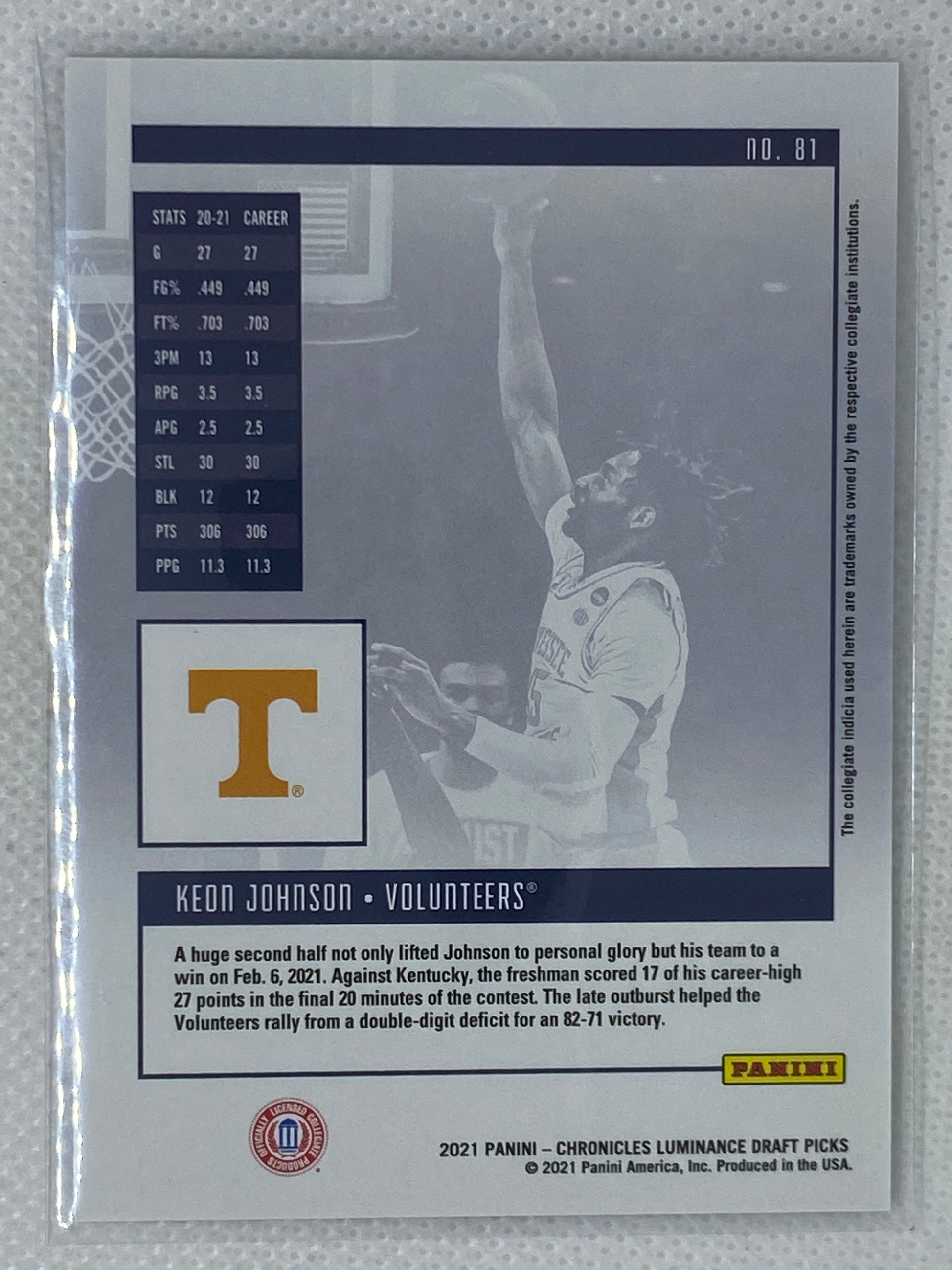Keon Johnson 2021-22 Chronicles Luminance Draft Picks RC Base #81 Volunteers