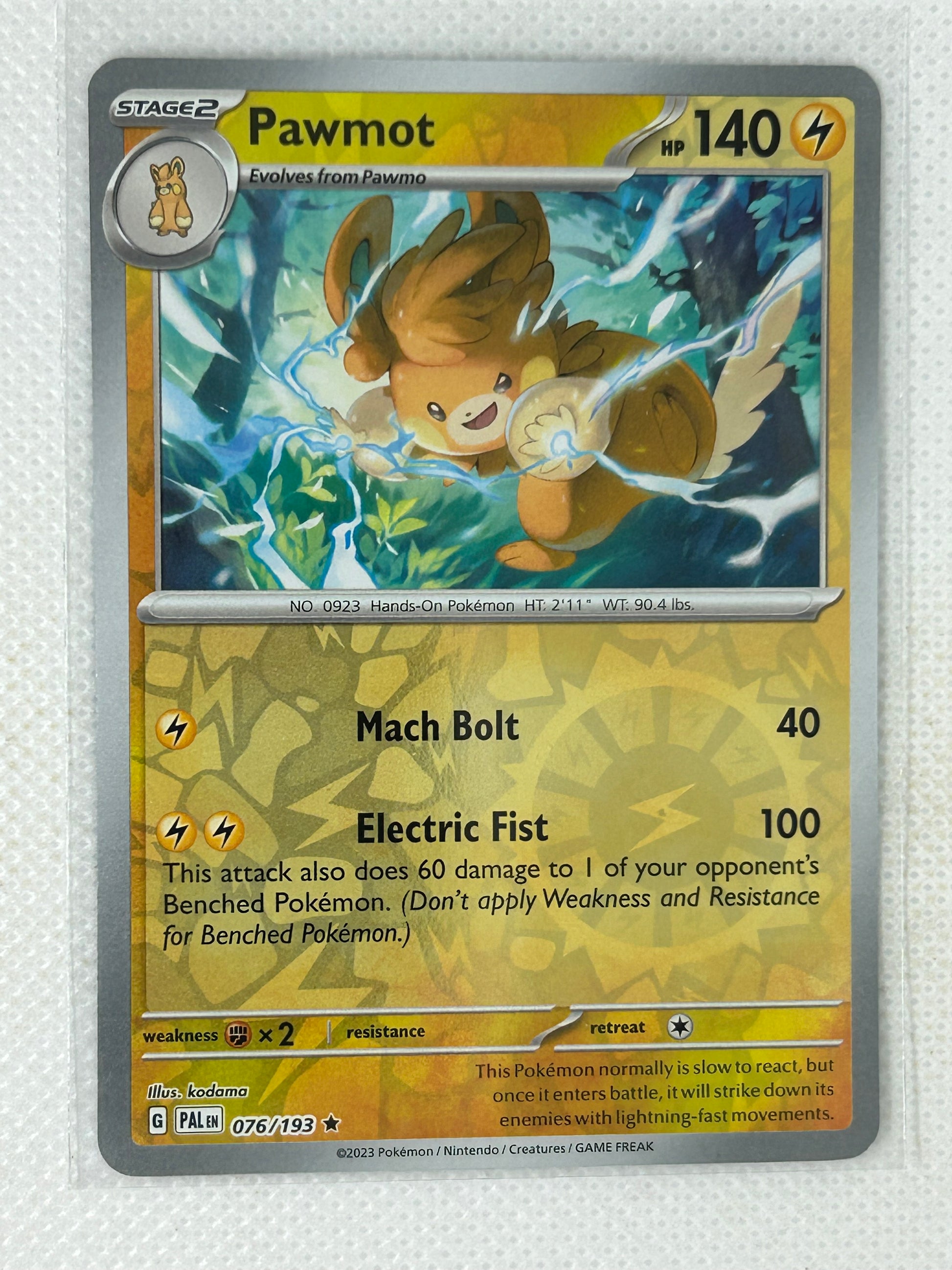 This Pawmot 76/193 Reverse Holo Paldea Evolved Pokemon Card is a valuable addition to any Pokemon card collection. With its striking reverse holo design and evolved Paldea form, it is sure to catch the eye of both collectors and players alike. Own a piece of the Pokemon universe with this rare card.