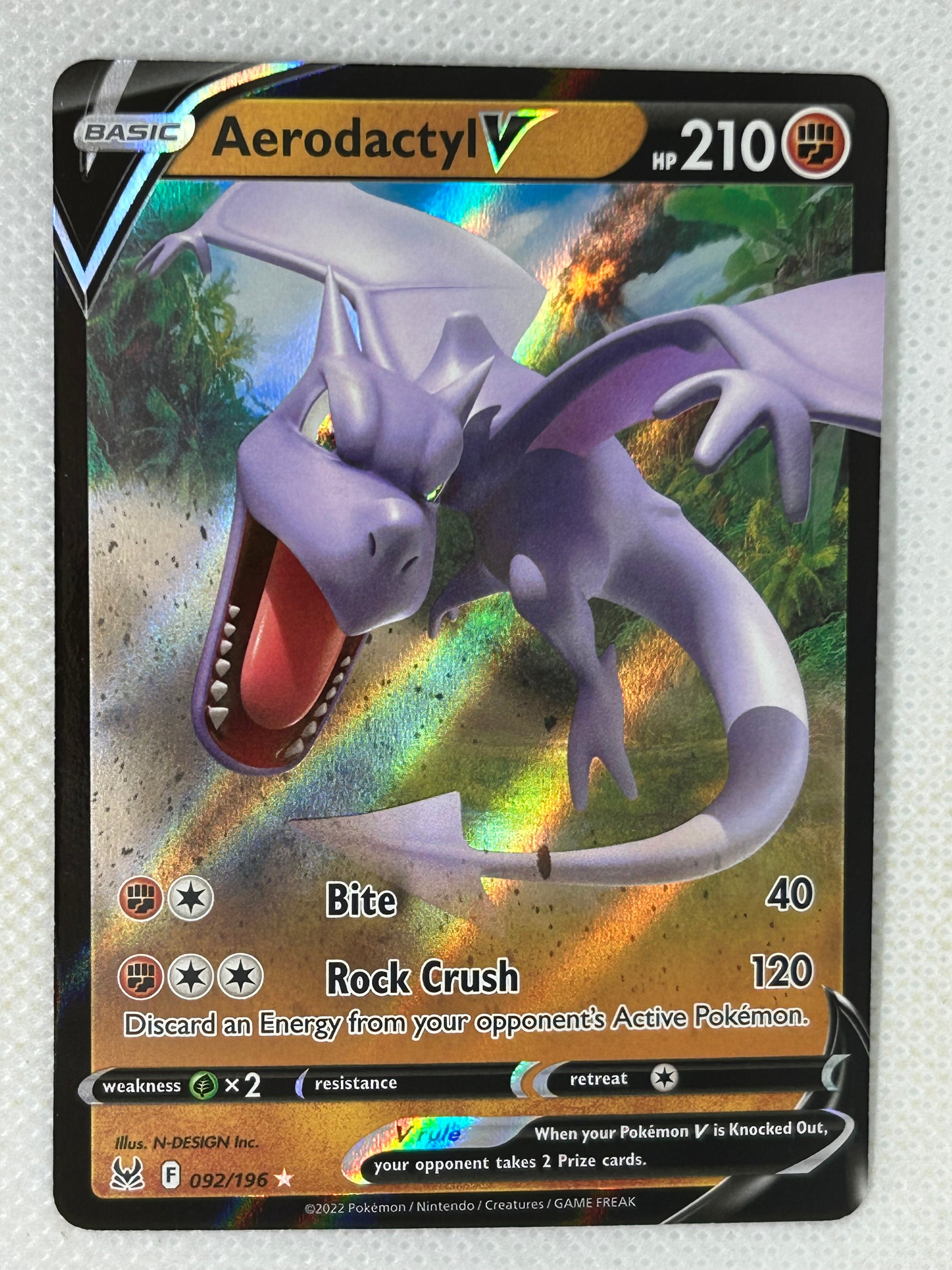 This product is a part of the Pokémon Lost Origin series and features a Full Art Holo design of Aerodactyl V, with the card number 092/196.