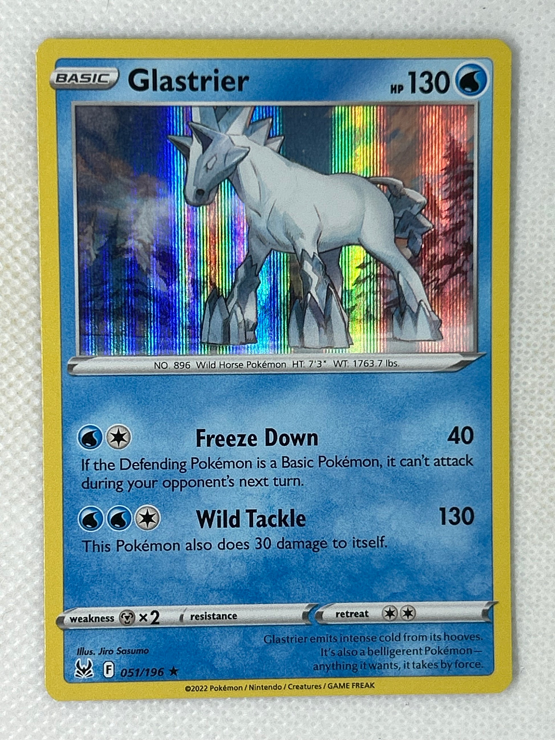 The Pokémon Lost Origin Glastrier 051/196 Holo Rare card features Glastrier, a legendary Pokémon known for its powerful ice abilities and formidable strength. Celebrated as a mighty steed in the Pokémon universe, Glastrier holds a significant role in battles and is highly prized by fans and collectors.