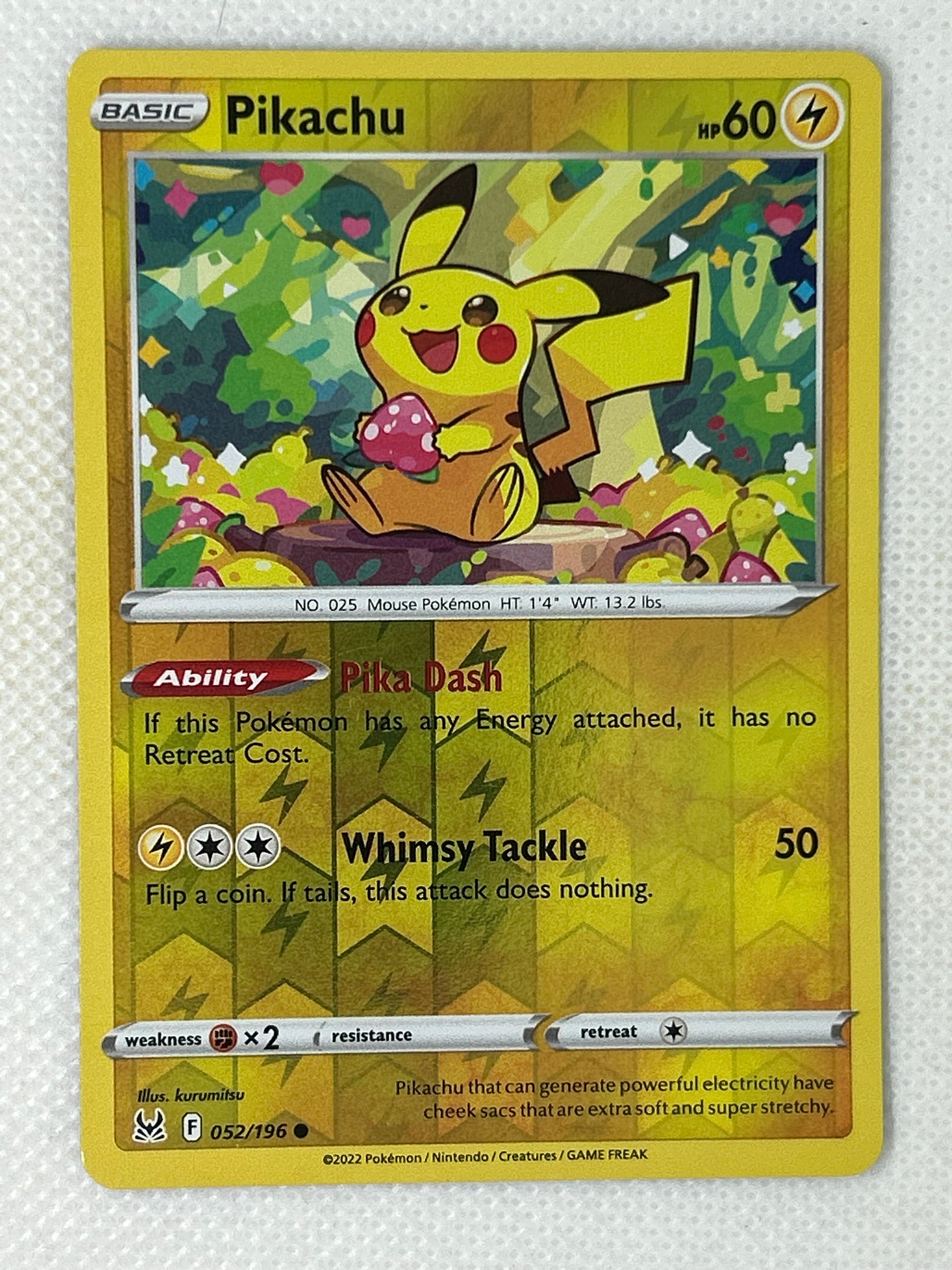 The Pokémon Lost Origin Reverse Holo Pikachu Love Sweet Romantic 52/196 card features Pikachu, the iconic Electric-type Pokémon beloved worldwide. Known for its role as the franchise mascot and its cheerful, friendly nature, Pikachu continues to be a central figure in Pokémon battles and stories, charming fans of all ages.
